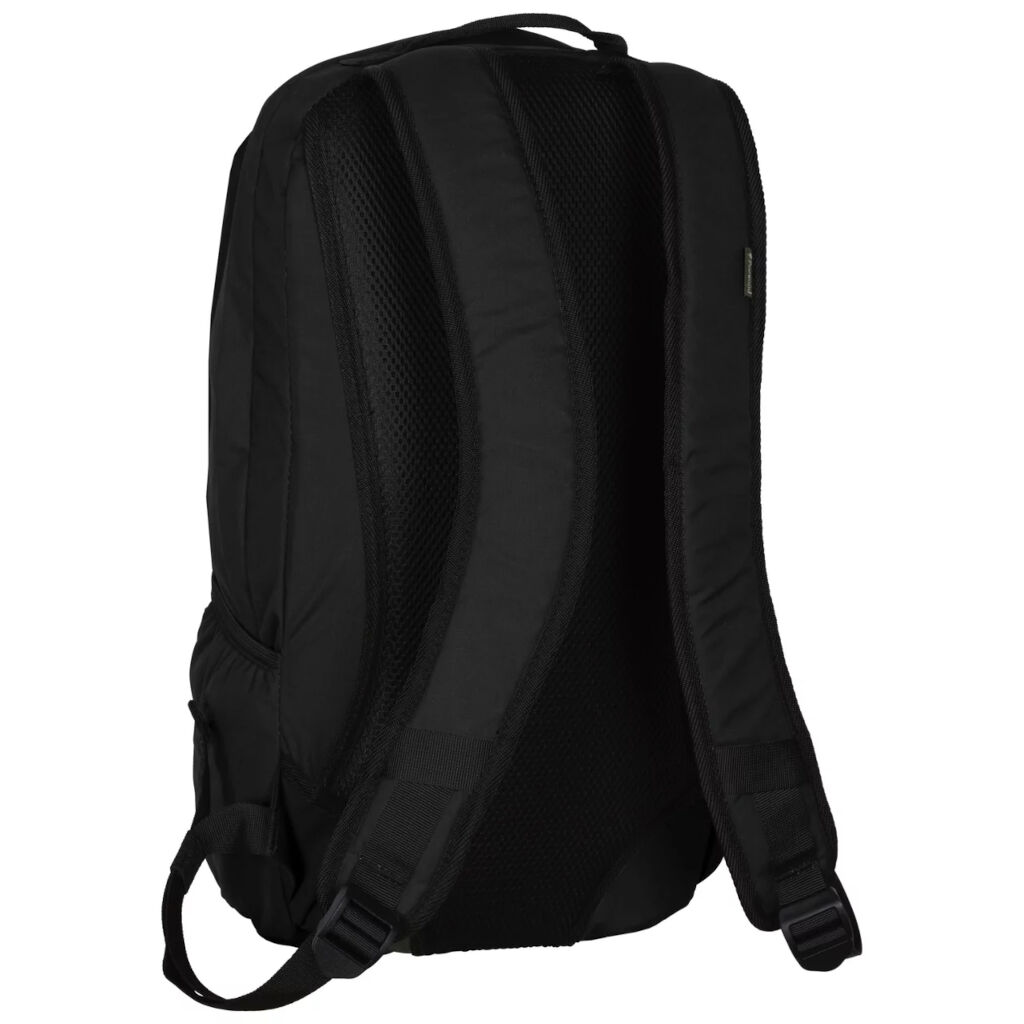 Praktisk og komfortabel rygsæk med polstrede skulderstropper, der nemt kan justeres. Polstret i ryggen for behagelig komfort. Flere rum for nem adgang til pakningen. Et lidt mindre rum langs toppen til fx en mobiltelefon. Et stort rum med plads til fx en bærbar computer, med en praktisk netlomme med lynlås indeni. Her er også siddeunderlag. Yderligere rum foran på rygsækken med netlomme i. På siderne af rygsækken er der to åbne elastiklommer til fx vandflasken. I bunden af rygsækken er der et skraldespand med en overflade, der kan tørres af.