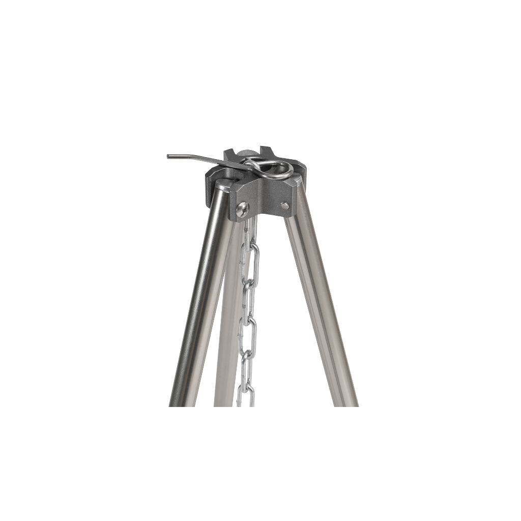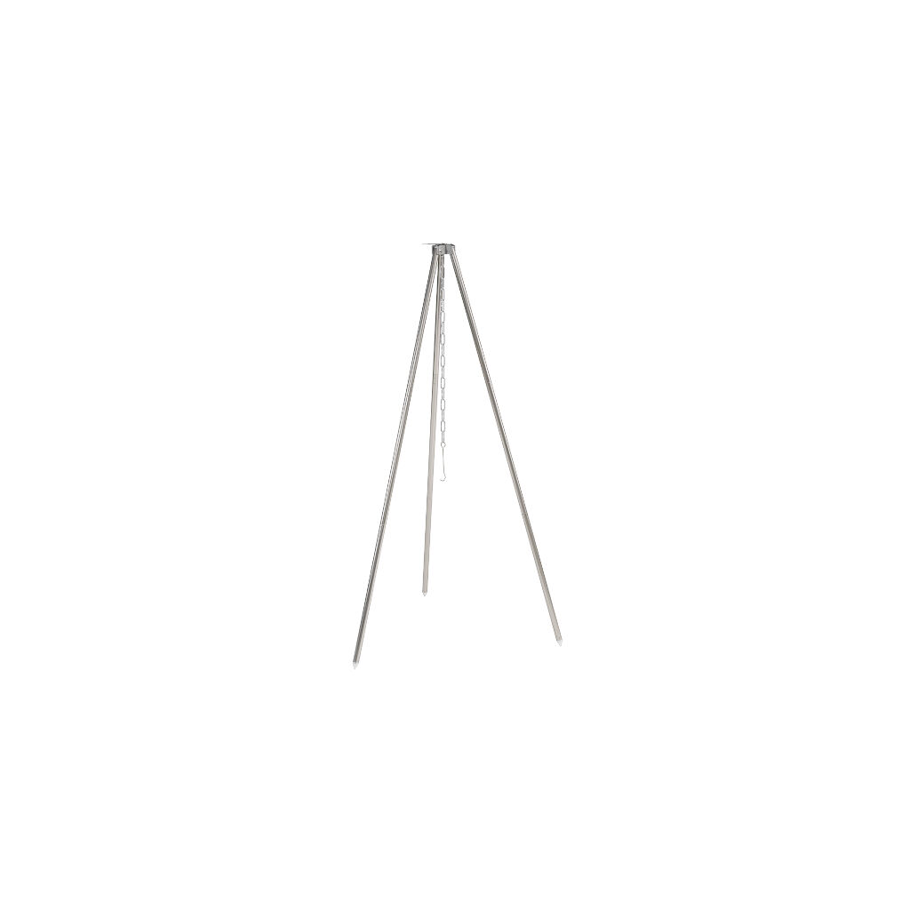 Stativ til madlavning over åben ild. Benene samles nemt med et kliklåsesystem og har spidse ender for stabilitet. Juster længden på kæden for at ændre afstanden til ilden. Kæde og krog til ophængning af en gryde over ilden medfølger.