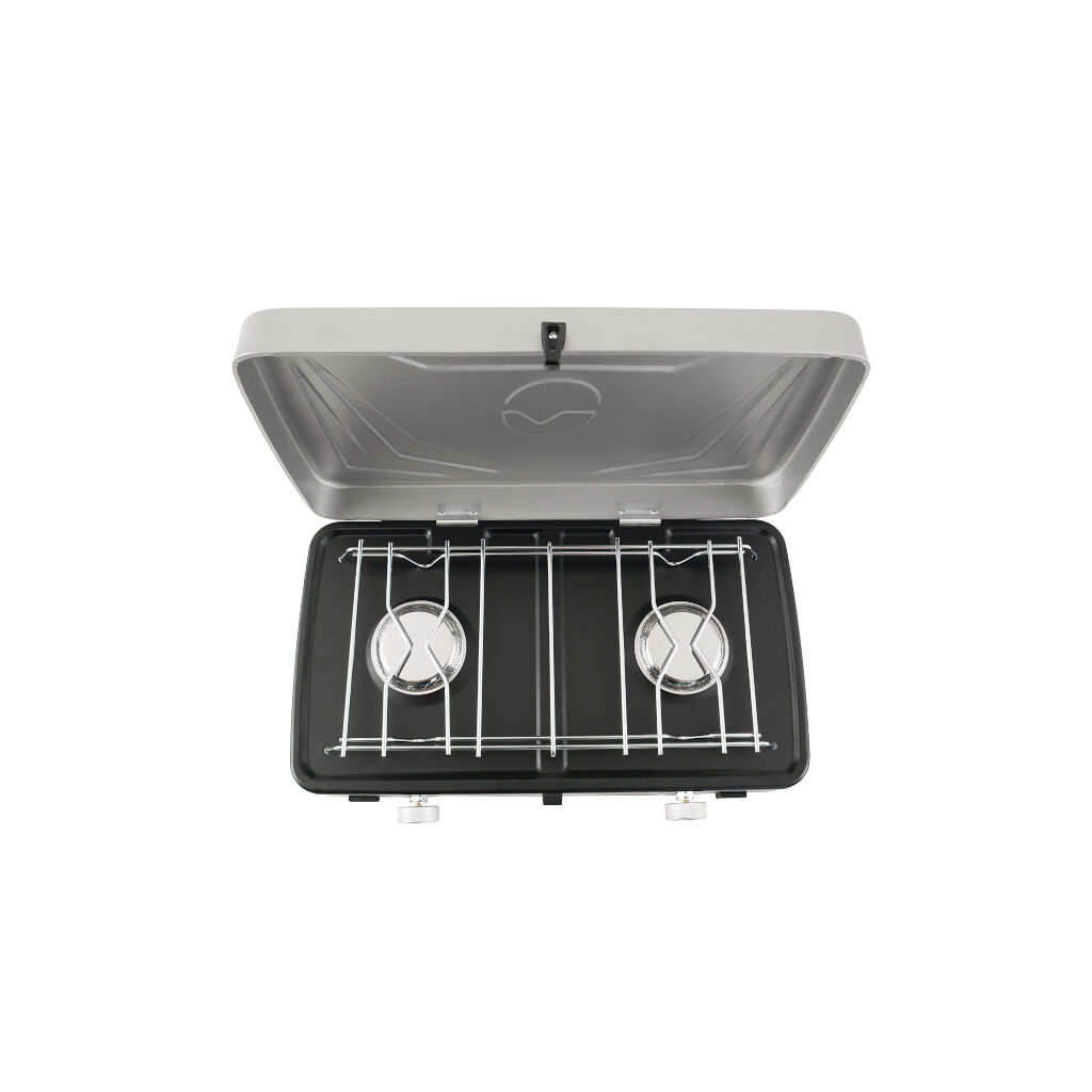 Prisvenligt gaskomfur til engangsflasker med høj effekt. Komfuret har to brændere i rustfrit stål og en indbygget vindskærm, som også fungerer som låg ved transport. Fødder sikrer, at komfuret står stabilt. Det aftagelige gitter for brænderne gør rengøringen nemt.