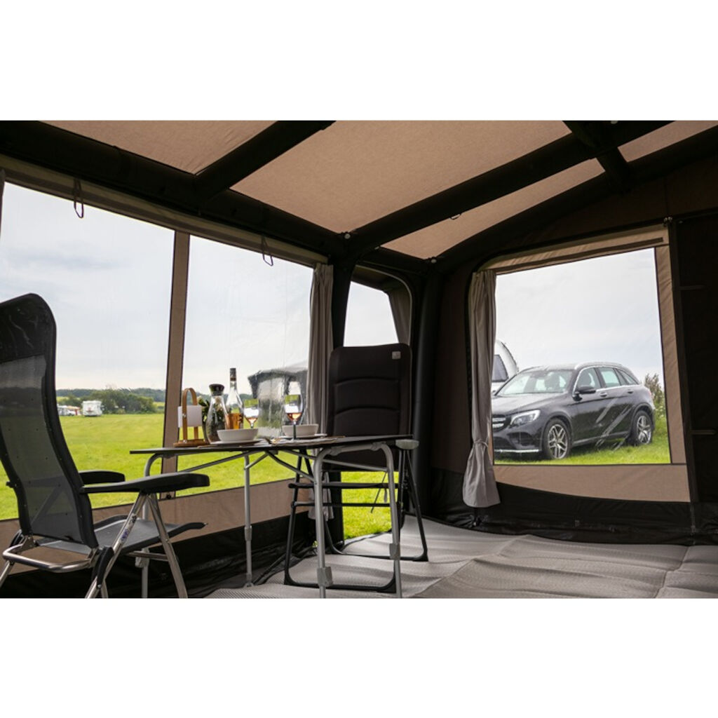 Telta Scenic 390 er et rummeligt og behageligt fortelt med en dybde på 300 cm og store åbningsbare vinduespaneler. De store vinduer foran på teltet giver både et behageligt lys og en følelse af rummelighed i teltet. Hvis man vil reducere indsigt, kan gardinerne trækkes for. Teltet er hurtigt at opsætte, og dets kraftige, åndbare dug reducerer kondens og giver et køligere klima på varme dage. Perfekt til dem, der camperer ofte eller rejser sydpå om sommeren. Teltet er let at montere og kan, takket være dobbelte kederlister, installeres på både campingvogne og autocampere. Fastgør blot teltdugen til campingvognens skinne eller skinnen på autocamperens markise, sæt fire pløkker i hjørnerne og pump de integrerede kanaler i teltdugen op, der danner rammen fra en ventil på teltet. Fastgør derefter tætningen mod campingvognen, og teltet er klar til indflytning.