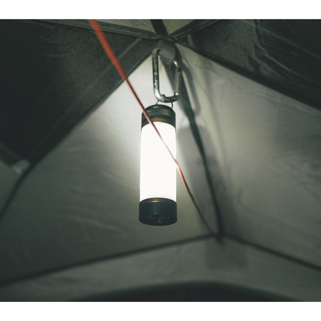 Lille, let og genopladelig campinglampe med hænger og kraftfuldt batteri.