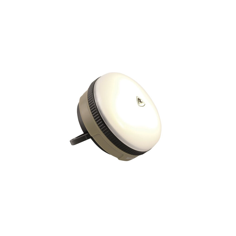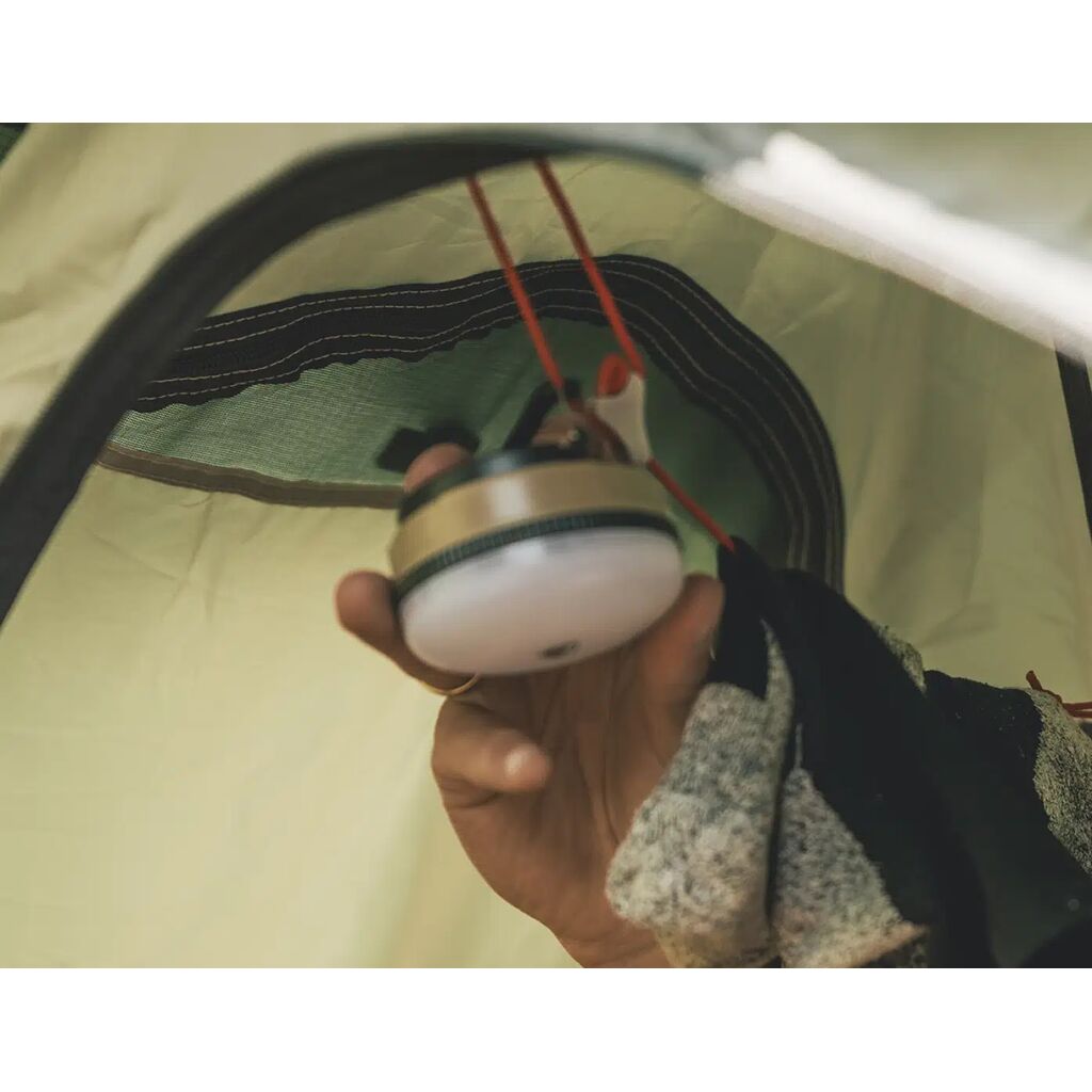 Lille og let campinglampe med ophæng til brug som loftlampe. Drives af 3 AAA-batterier.