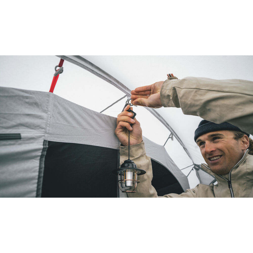 Lille, let og genopladelig campinglampe med hænger og kraftfuldt batteri.