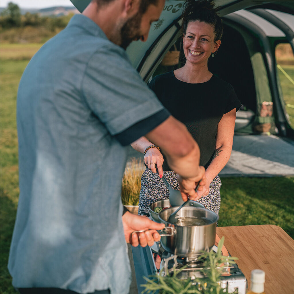 Campinggrill til engangsflasker med dobbeltbrændere på 2200W. Fødder med et godt greb gør, at grillen står stabilt og den lave profil gør den meget pakbar.
