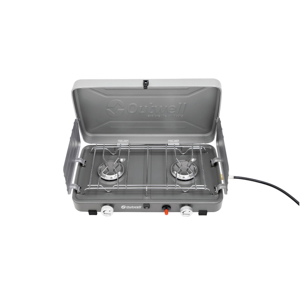 Campingovn med to kraftige brændere på 3000W. Det, der gør komfuret unikt, er, at det bruger gaspatroner (samme som til udekøkkener), hvilket gør det nemmere at håndtere og fylder mindre i pakken.