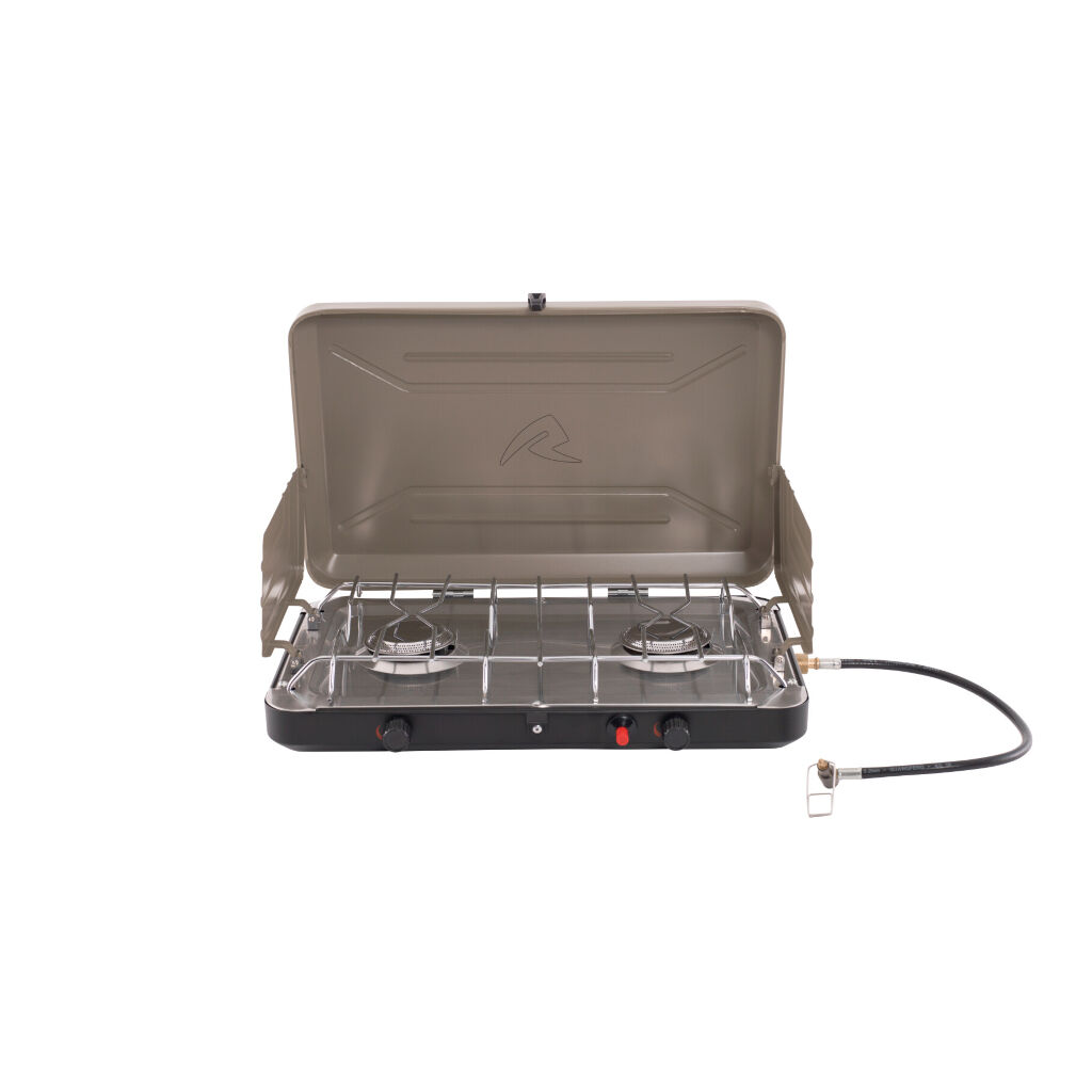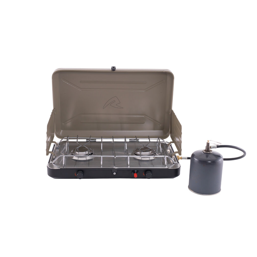 Kraftig campingkøkken til engangsflasker. Køkkenet har to brændere i rustfrit stål samt indbygget vindskærm, der også fungerer som låg under transport. Aftageligt gitter til brænderne gør det let at rengøre. Begge brændere tændes med den indbyggede piezotænder.