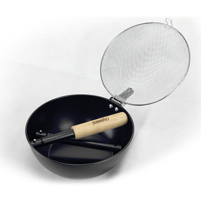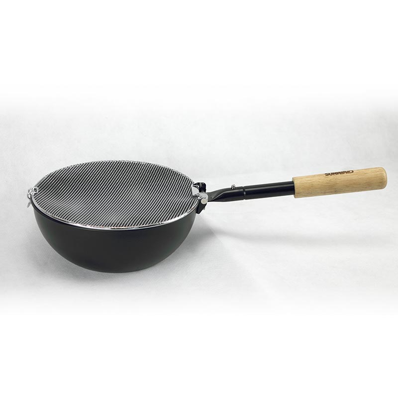 Popcornpande med justerbart håndtag, trægreb og grill, der er nem at bruge tilpasset til madlavning over åben ild eller bålpande.