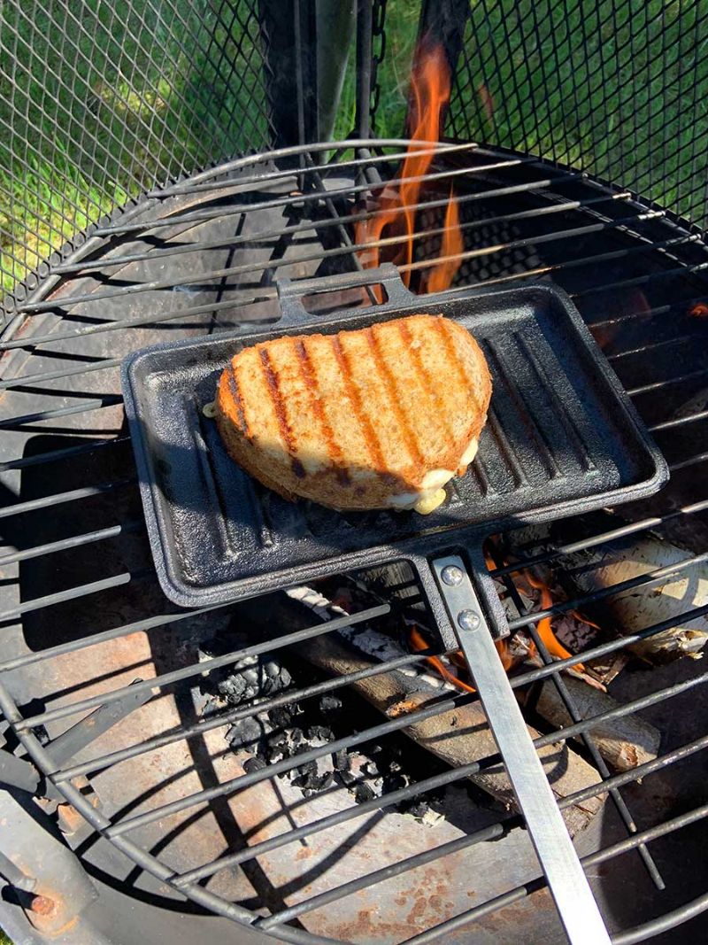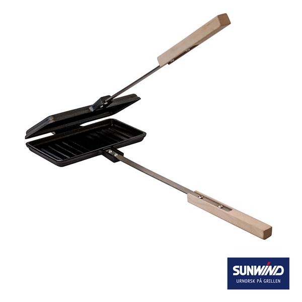 Sandwichjern i slidstærkt støbejern til madlavning over åben ild eller bålpande. Langt håndtag med træhåndtag, så det ikke bliver for varmt at holde.