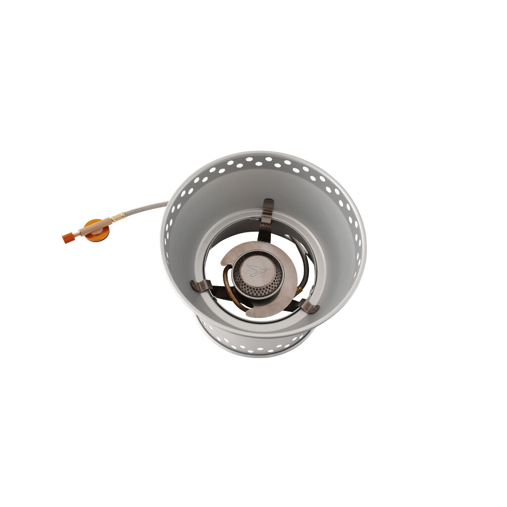 Stormkøkken i aluminium med gasbrænder i rustfrit stål med forvarmningssystem. Køkkenet leveres med 2 gryder (1,3 L og 1,5 L), 1 stegepande/tallerken 20,5 cm samt 1 håndtag. Den brede base på køkkenet sikrer stabilitet, og beskyttelsen af brænderen giver god vindmodstand.