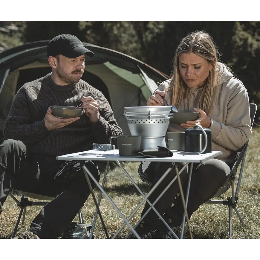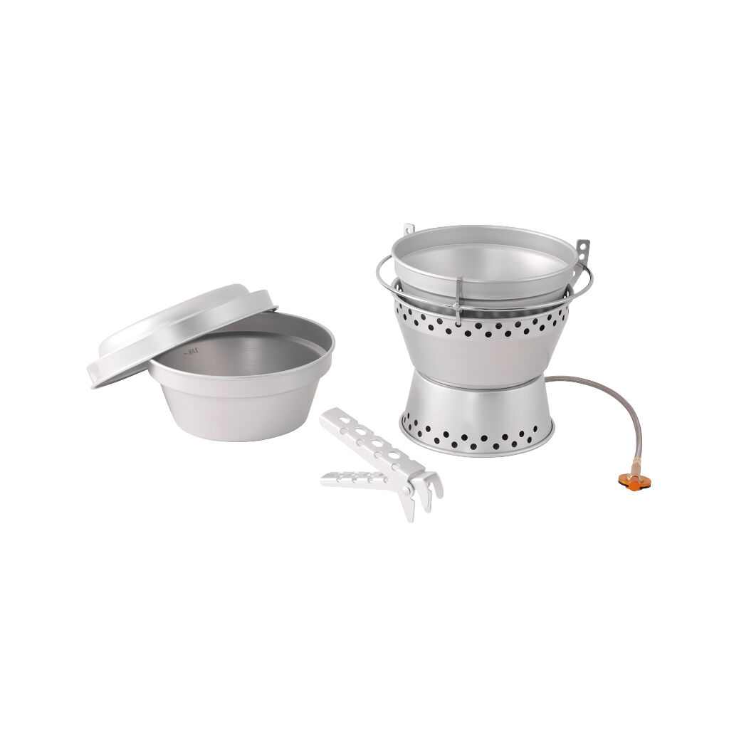 | Inkluderet i pakken | 2 kastruller (1,3 L og 1,5 L), 1 x Stekpanna, 1 x Håndtag for kastrull og stekpanna, 1 x Gasbrännare, 1 x Kastrullholdere og vindbeskyttelse |