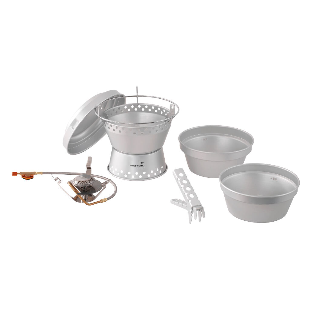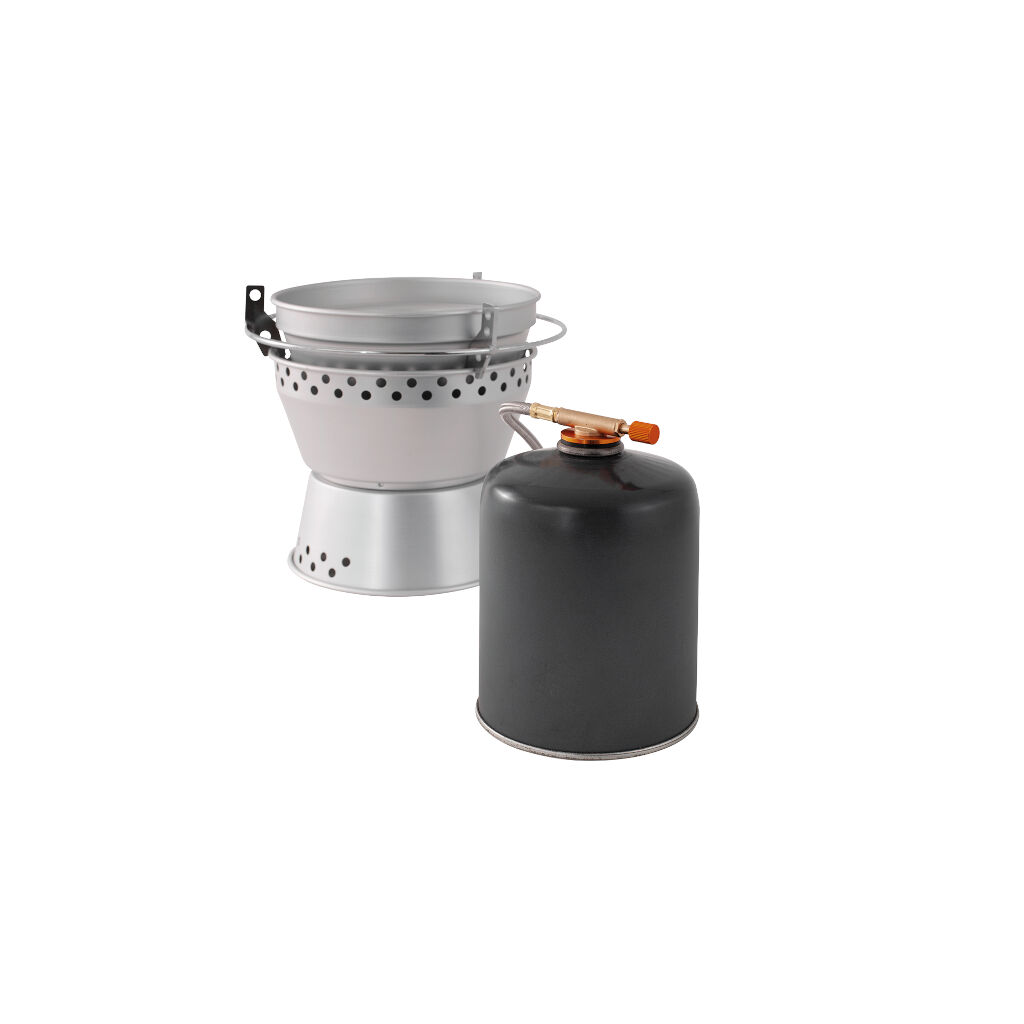 Pakkevenligt og prisvenligt stormkøkken i anodiseret aluminium med gasbrænder. Inkluderer to gryder og en stegepande samt et håndtag.