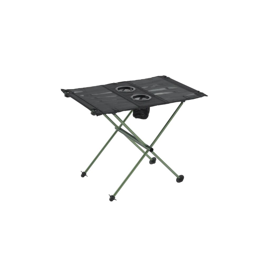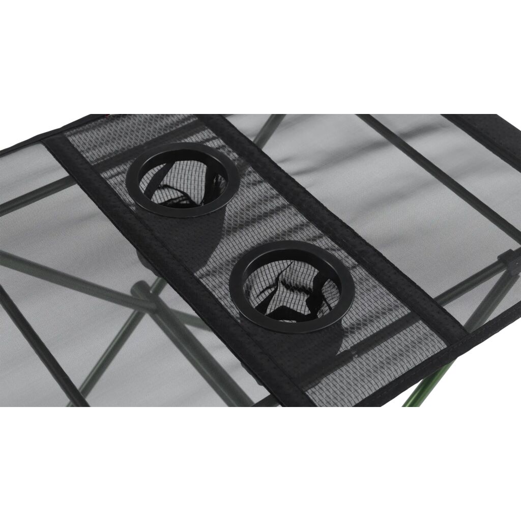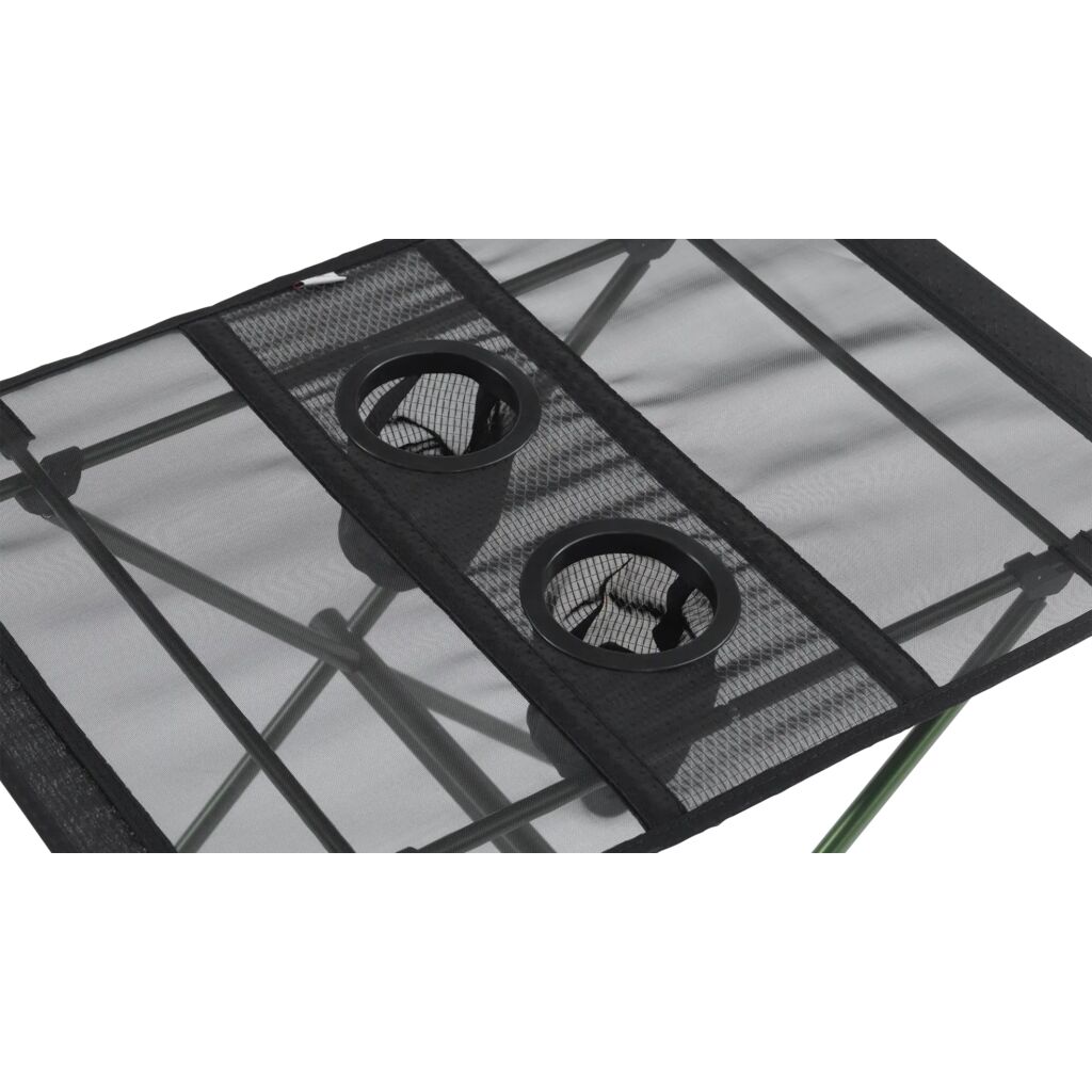 Lille og let bord med aluminiumsramme, bordplade i mesh og to integrerede kopholdere. Kompakt pakkestørrelse og let at folde sammen og pakke i den medfølgende bæretaske.