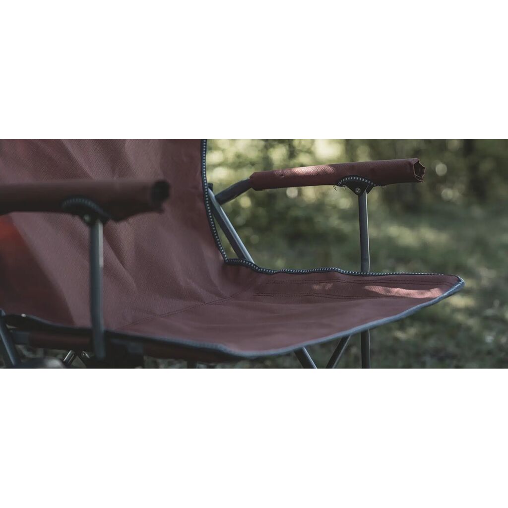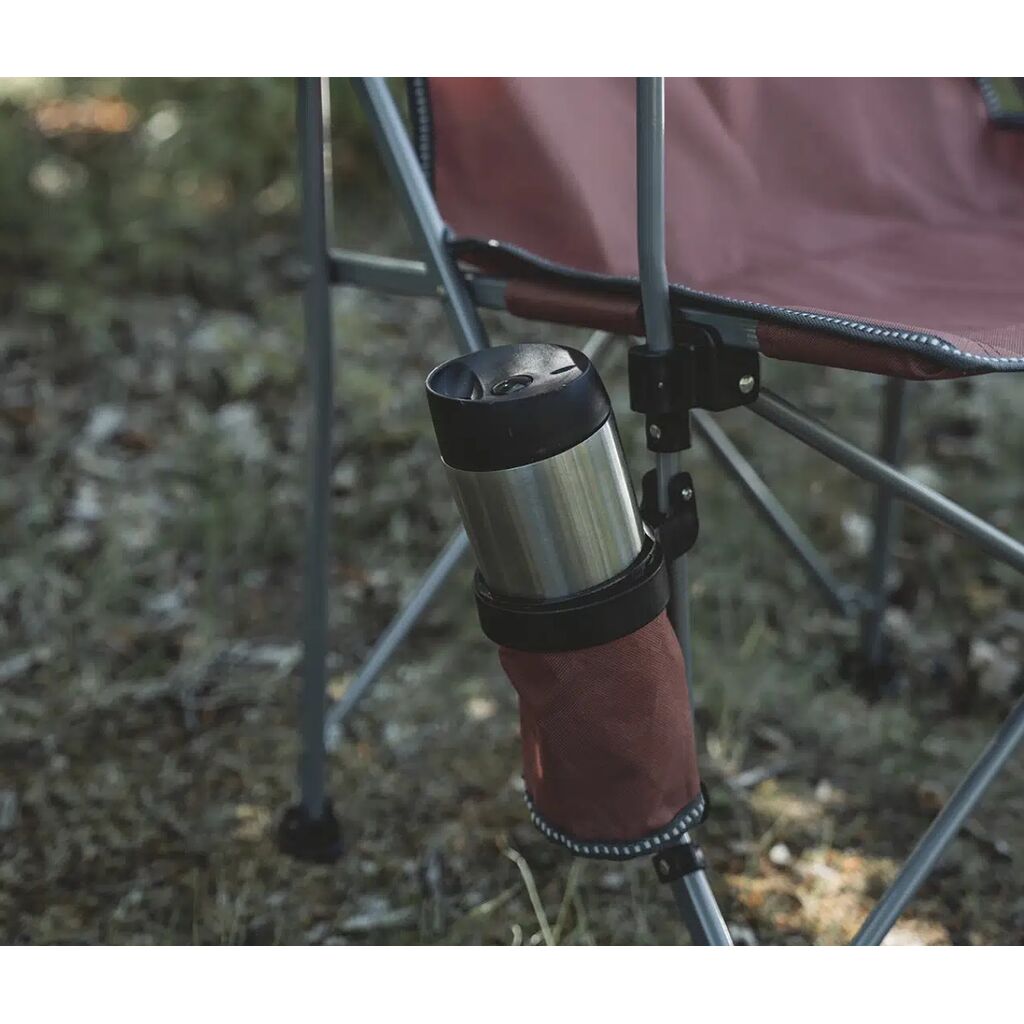 Pakkevenlig campingstol med robust stålramme, polstrede armlæn og kopholder. Kan bære op til 110 kg.
