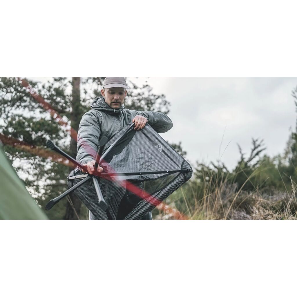Pakvenlig campingstol med aluminiumsramme, sæde i ripstop-nylon og åndbare meshpaneler på siderne. Stolen har teleskopisk design, drejefunktion og ben, der kan justeres i forskellige højder.