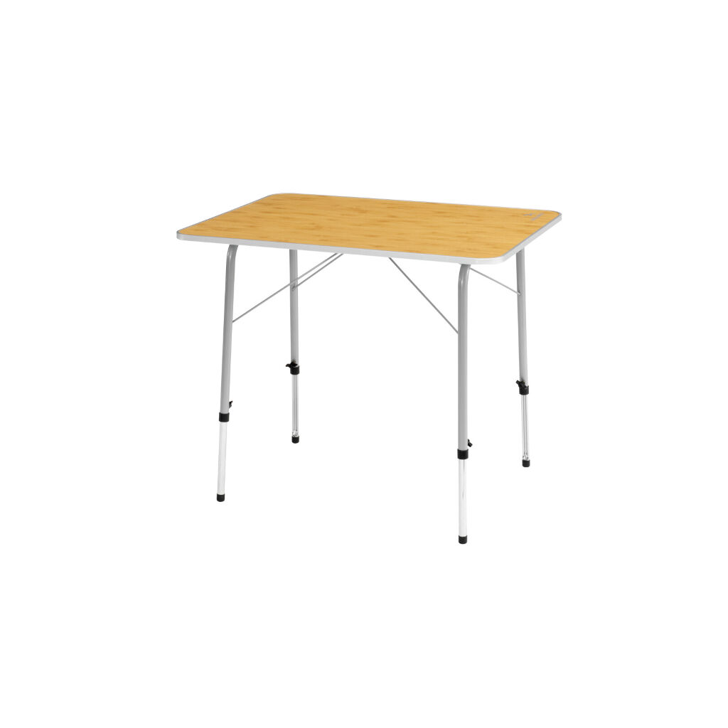 Klapbord med stålramme og bordplade i bambus laminat som kan justeres i højden. Da benene kan klappes sammen på midten, når det pakkes ned, er det let at håndtere og fylder meget lidt i oppakningen.