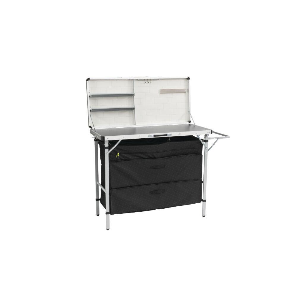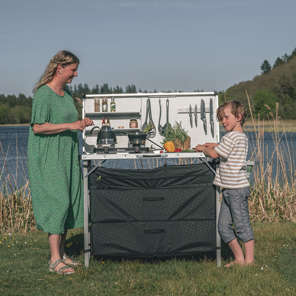 Smart og hurtigmonteret køkkenbænk med meget gode opbevaringsmuligheder for alle køkkenbehov på campingpladsen. Robust bordplade, hvor et låg klappes op for at skabe læ for bænken, som også har en aftagelig vaskebalje. Bordpladen giver god plads til madlavning, og de to større skabe rummer køkkenudstyr og spisekammer varer.
