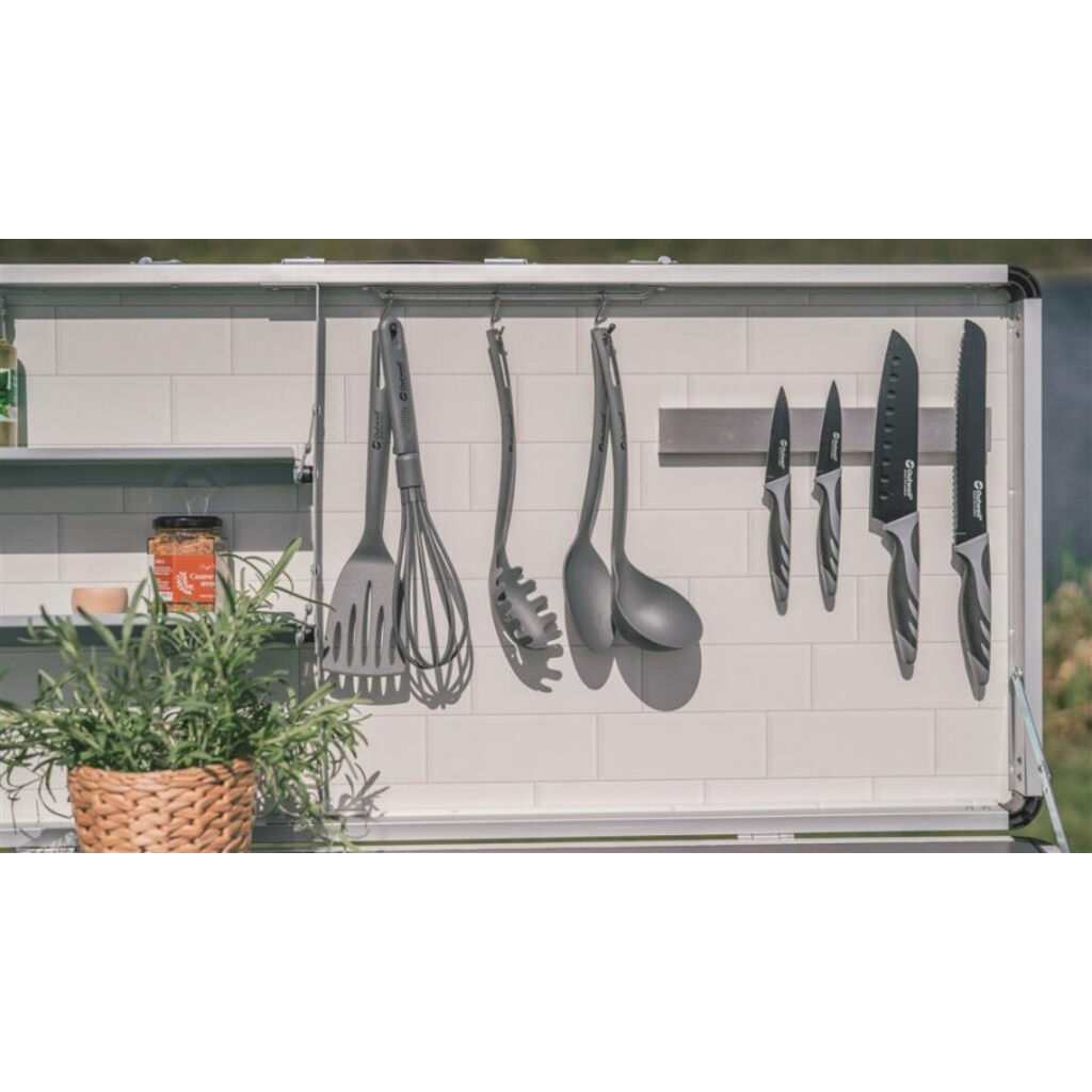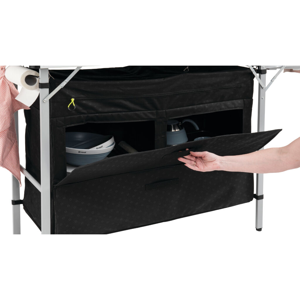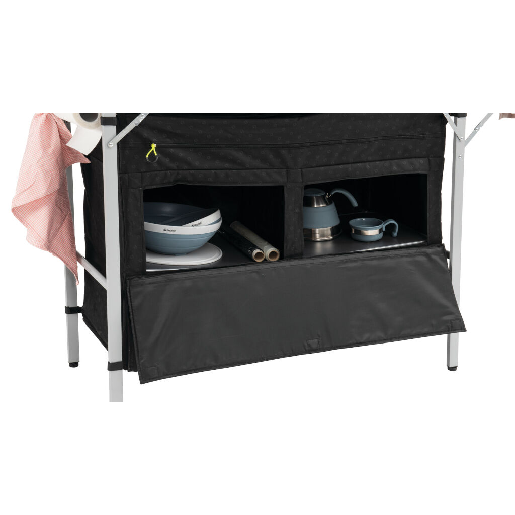 Køkkenbænk med et vindbeskyttet arbejdsområde, plads til komfur samt en aftagelig vaskebalje og flere gode opbevaringsmuligheder gør Magante til et perfekt valg for campister, der ønsker at håndtere opbevaring og madlavning ét sted. Køkkenbænken tilbyder velovervejede opbevaringsløsninger, som inkluderer to store opbevaringsskabe med magnetdøre, en lavere net-hylde med lynlås og en magnetisk knivholder. Outwell Magante Køkkenbord er let at samle takket være foldbare ben, og når den er foldet sammen, har den en meget lille pakkestørrelse.