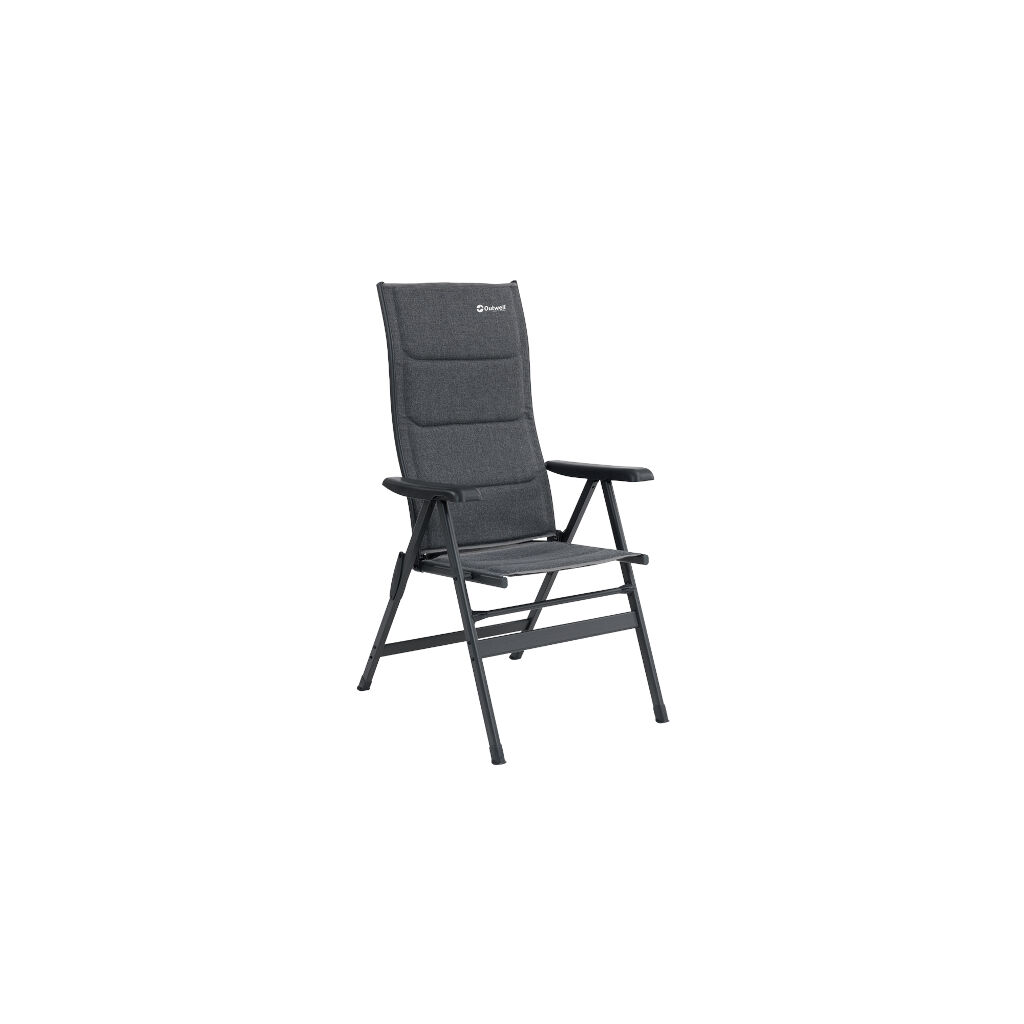 Campingstol fra Outwell med højt ryglæn og meget blødt og slidstærkt stof med polstring. Den bløde polstring og et ryglæn med syv positioner giver god komfort både ved spisebordet og i solen. Et kraftigt stel i pulverlakeret aluminium gør, at stolen har en maksimal belastning på 150 kg. Stolen leveres med 3 års garanti.