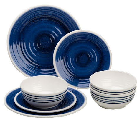 Service i 12 dele til fire personer i melamin. Melamin er perfekt til camping, fordi det er let, meget holdbart og nemt at rengøre. Alle dele kan vaskes i opvaskemaskinen.