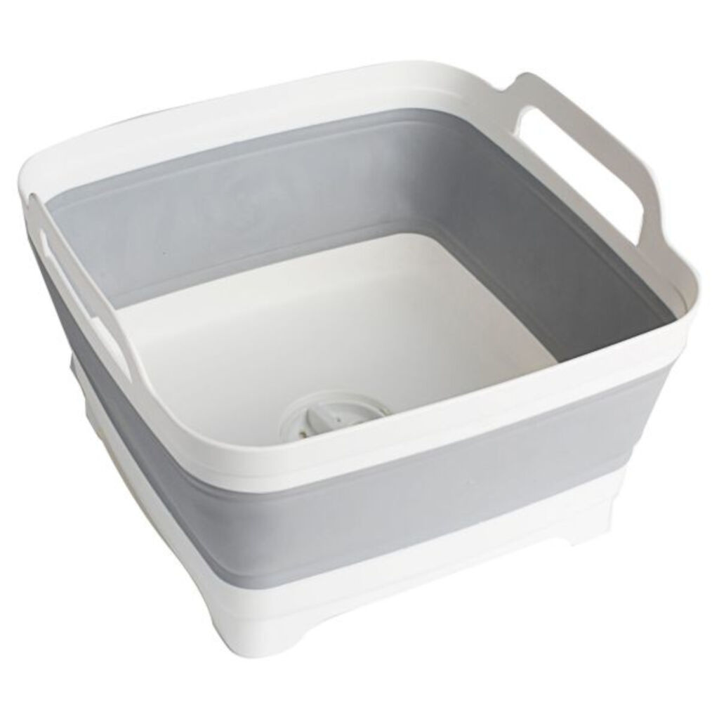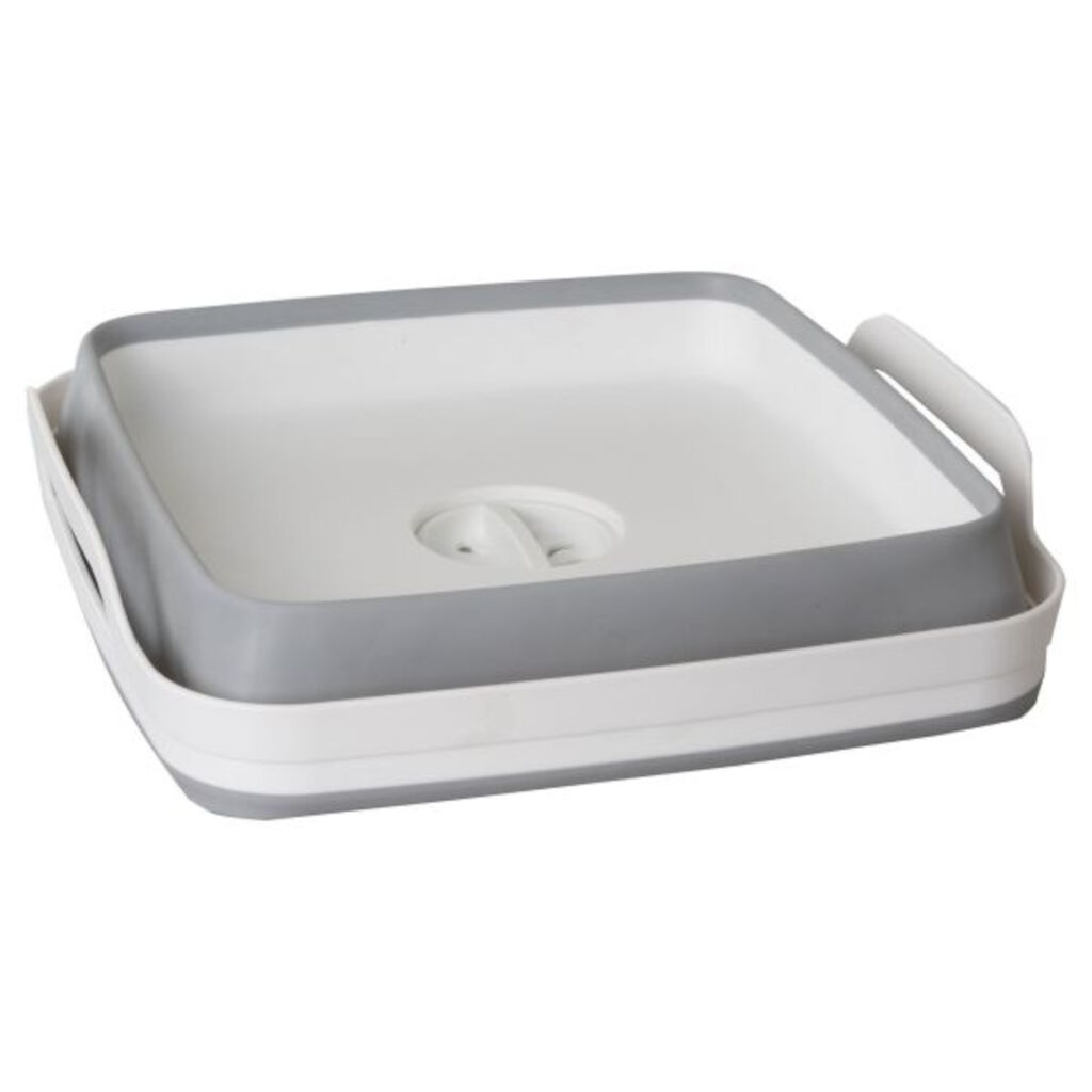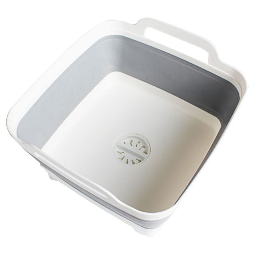 Smart sammenfoldelig vask med indbygget afløb og prop. Når den ikke er i brug, kan den komprimeres til kun 7,5 cm i højden, hvilket gør den nem at tage med på campingturen.