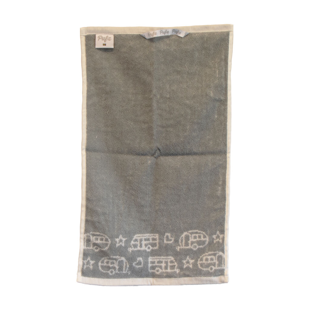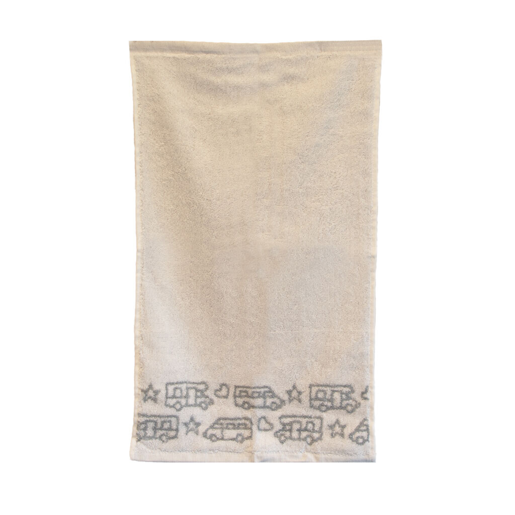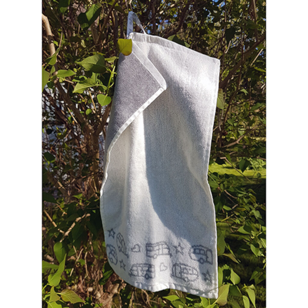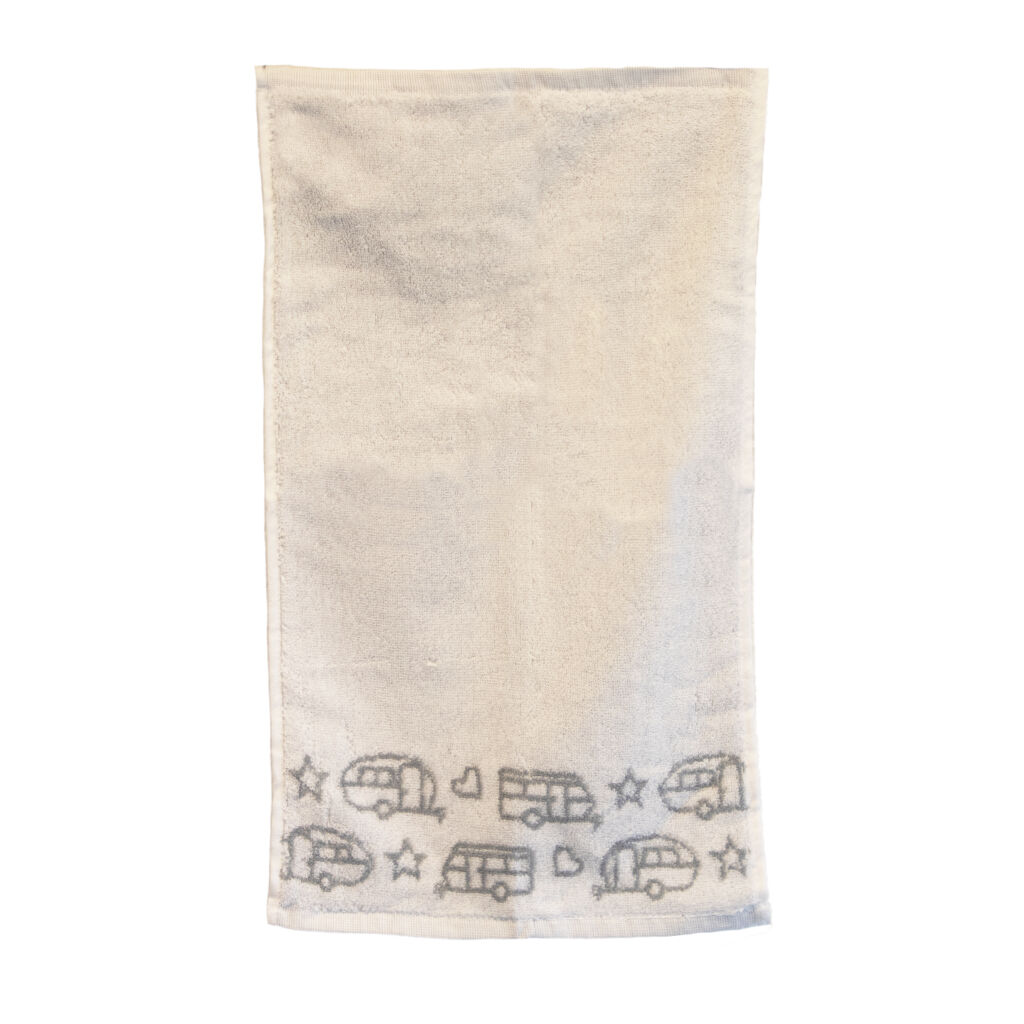 Håndklæde med campingvogn- / autocampermotiv. Lavet af 100% bomuldsfrotté med god sugeevne.