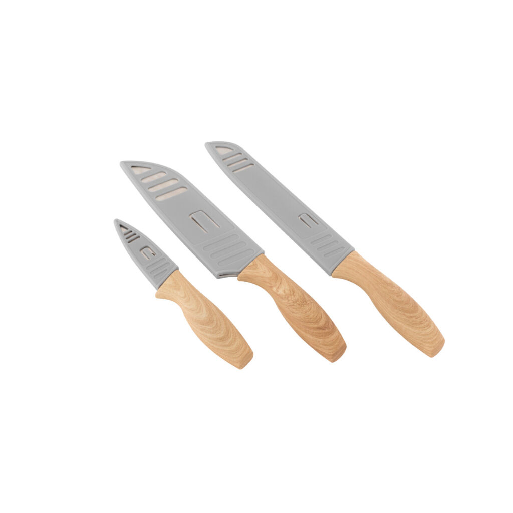 Knivsæt i tre dele. Blade i rustfrit stål og beskyttelse til knivene for sikker transport og opbevaring.