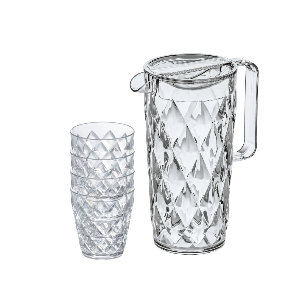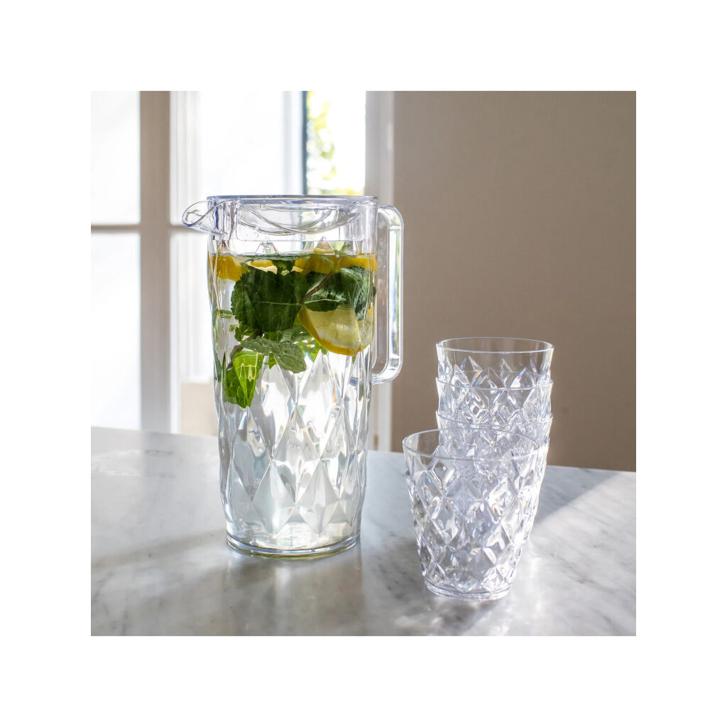 Karaffel med 4 glas i en moderne stil. Glassene passer ind i kanden under transport eller opbevaring. Lavet af et brudsikkert, 100% genanvendeligt plastmateriale, der ligner almindeligt glas.