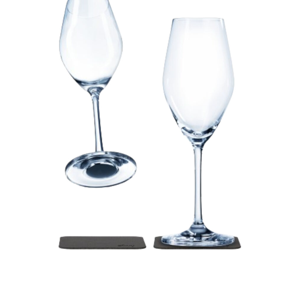 Tyskproduceret vinglas i krystal med en kraftig magnet på bunden, som holder glasset på plads under transport. En virkelig smart løsning, der forhindrer glassene i at glide eller rasle under transporten. To sorte magnetiske monteringsplader medfølger med nano gel pad, som du kan klæbe på enhver overflade for at holde krystalglassene på plads. Monteringspladerne består af en overflade af gummi og en klæbrig underside, der kan fastgøres på alle overflader uden at efterlade rester. Hvis klæbemidlet mister sin evne, kan det genaktiveres ved at skylle i vand.