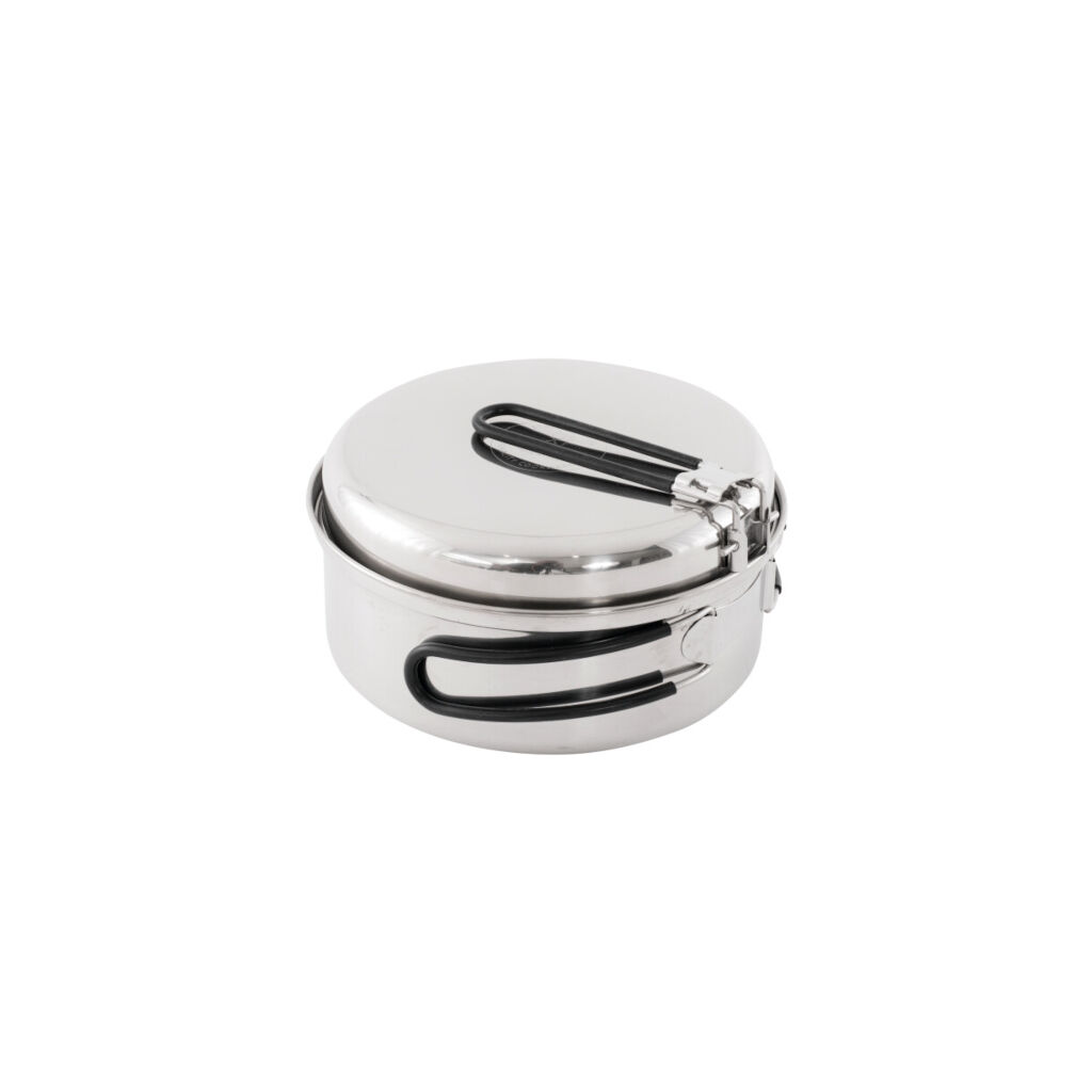 Holdbart og stilfuldt pandesæt lavet af rustfrit stål, der kan pakkes i en lille pakkestørrelse.