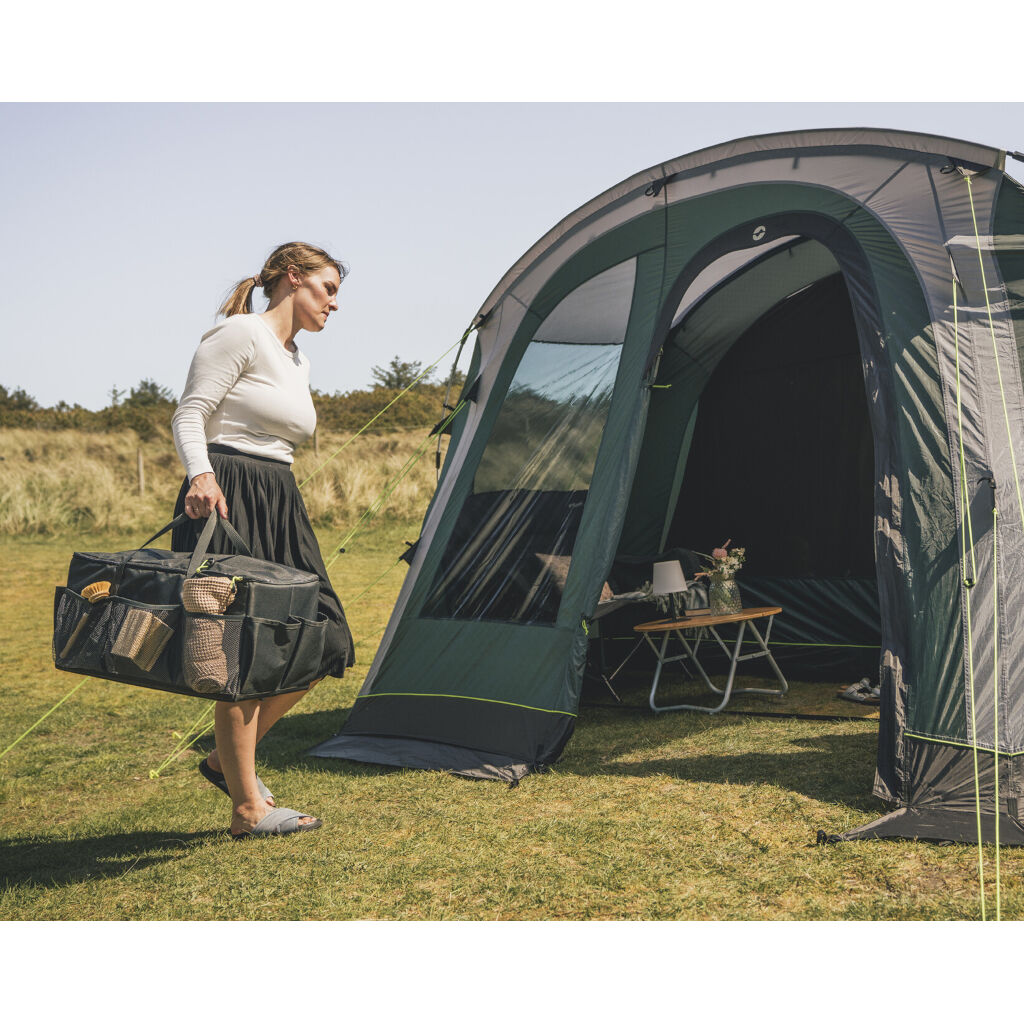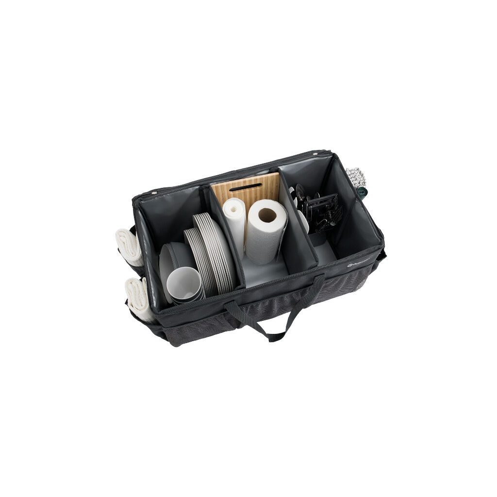 Praktisk opbevaringsboks med flere rum, der holder styr på service og andre køkkentilbehør, som du ønsker at tage med på campingturen eller picnicen. Store rum med aftagelige skillevægge hjælper dig med at tilpasse pladsen og giver hurtig adgang til dine ting. Når boksen ikke er i brug, kan den nemt foldes sammen til en kompakt størrelse og opbevares eller transporteres med den medfølgende taske.