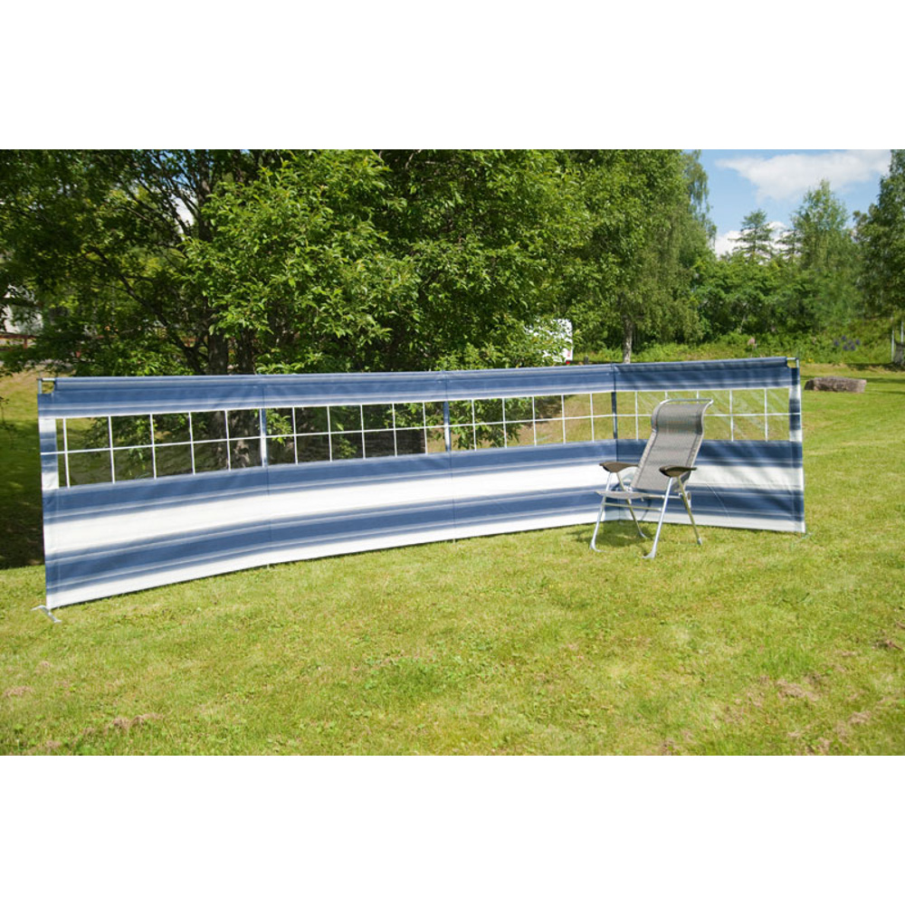 Svensktillverkat vindskydd med fönster från Svenska Tält i Dorotea. Genom en stålram i stället för bara stänger har vindskyddet en extra bra stabilitet mot vind.