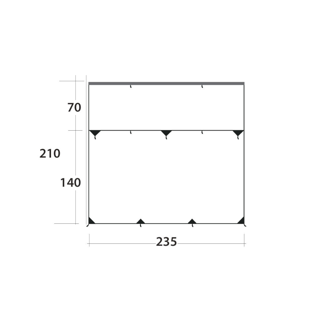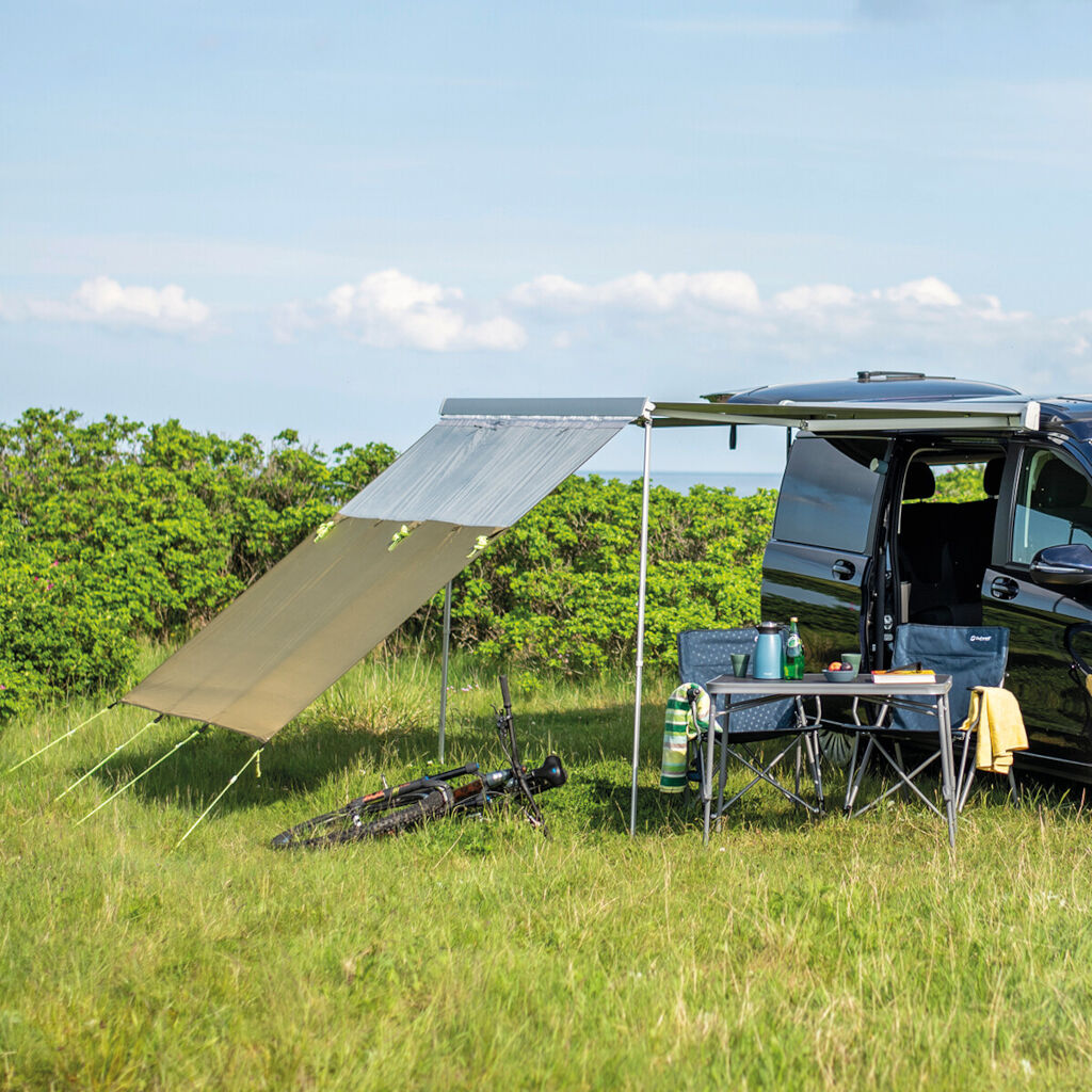 Outwell Hillcrest Tarp er et fleksibelt solskærm, der giver beskyttelse, skygge og privatliv. Det monteres nemt på fronten af markisen og kan tilpasses med stænger eller ekstra sidepaneler for øget beskyttelse.