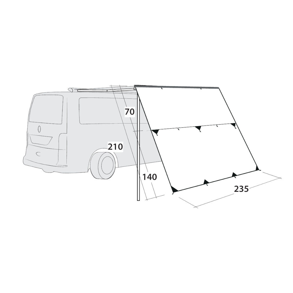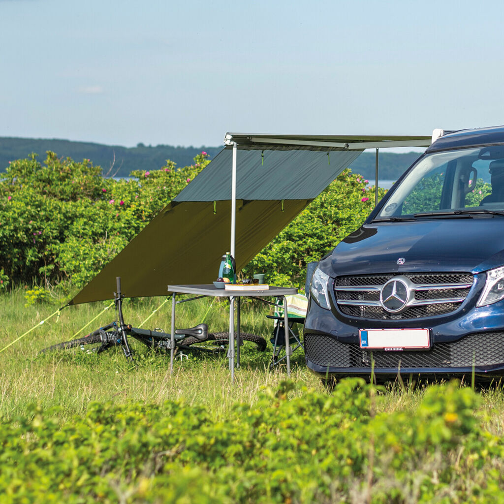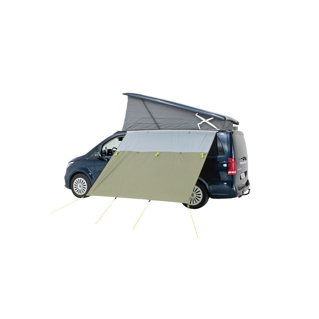 Hillcrest Tarp er en praktisk og fleksibel solskærm, der tilbyder beskyttelse, skygge og privatliv under rejsen. Den kan nemt monteres på markisens front eller bilens kederliste og sikres med stormliner og pløkker. Tarpen kan bruges til at skabe et beskyttet opholdsområde ved bilens dør eller for at give skygge på den anden side. Med robuste øjer kan den spændes op med stænger eller rulles op for at beskytte mod vejr og vind. For ekstra privatliv kan den kompletteres med Fallcrest Side Panel Set.