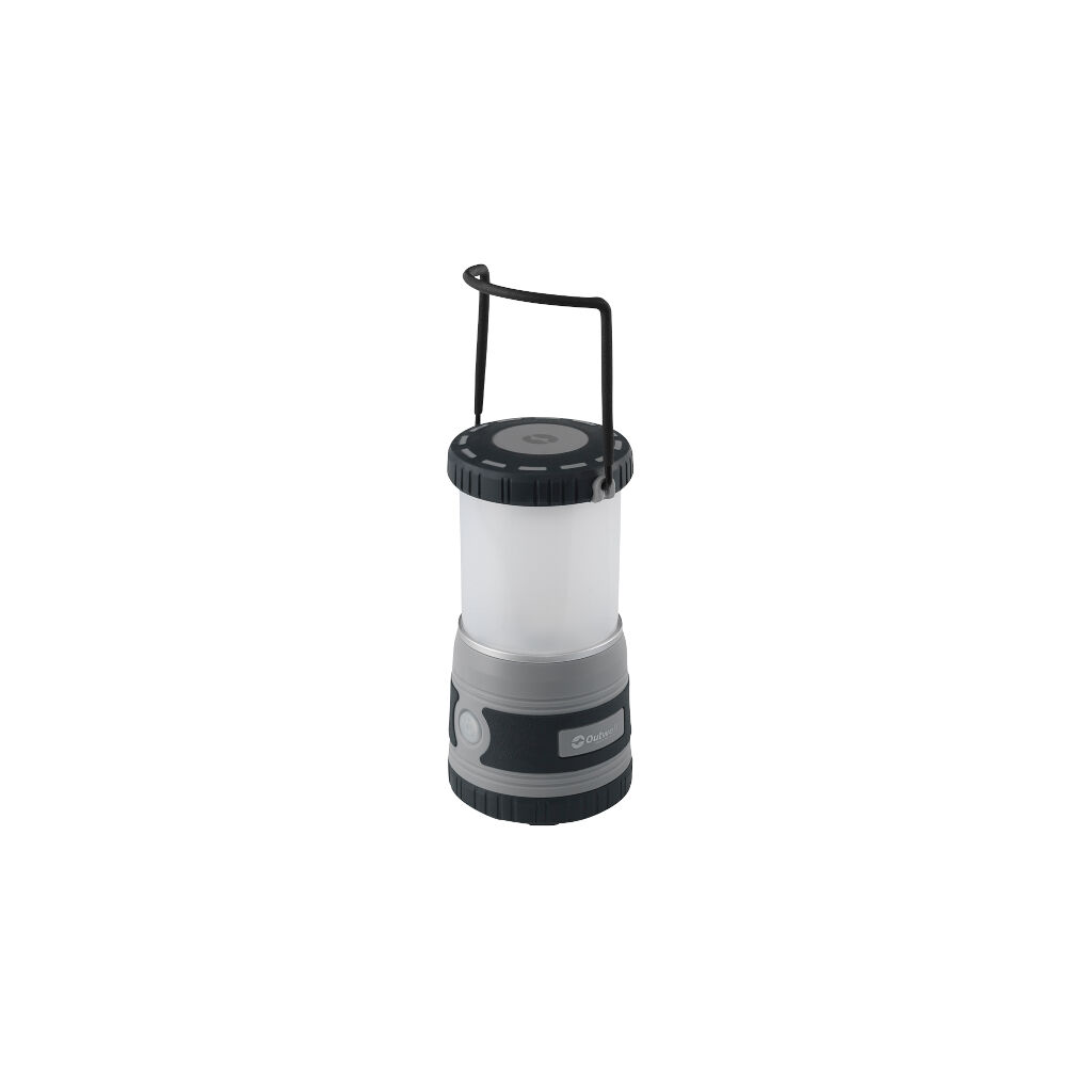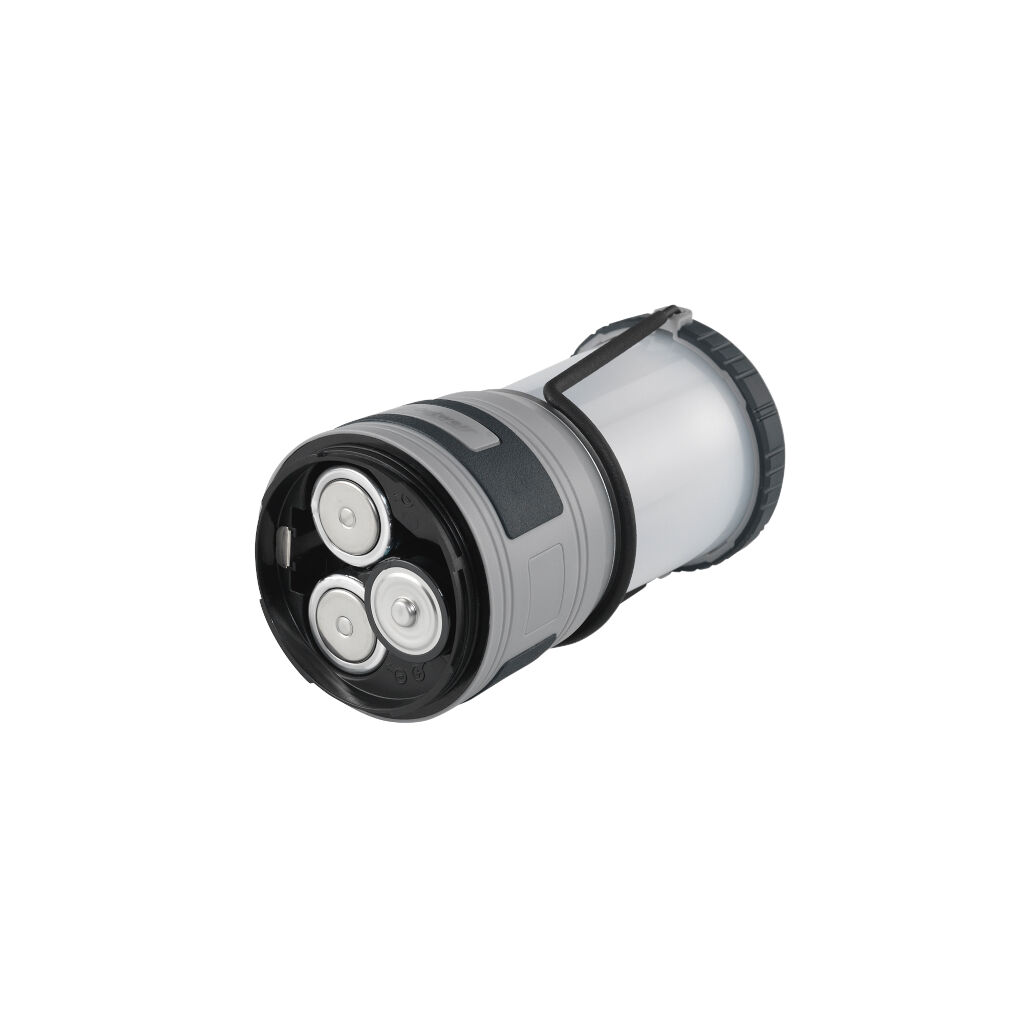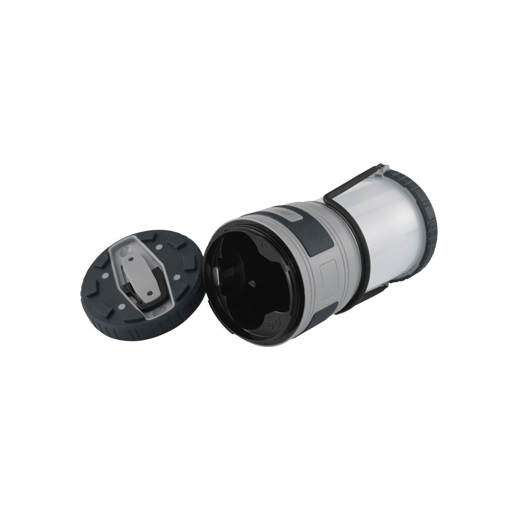 Lysstærk campinglygte med bærehåndtag. Takket være krog i bunden og aftagelig top kan den hænges op i teltet som loftlampe. Bruger 3 x AA-batterier (medfølger ikke).