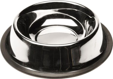 Større mad- eller vandskål i slidstærkt rustfrit stål med gummiring på undersiden for stabilitet.