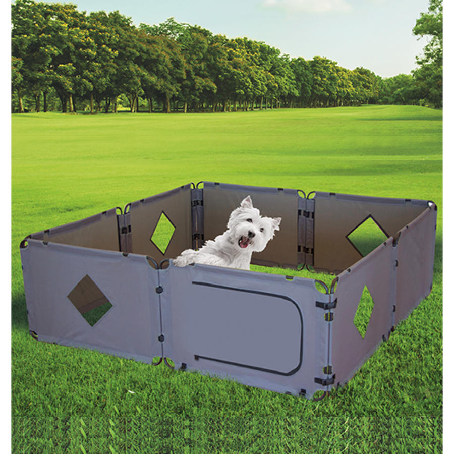 Transportabel hundekennel / hundegård til camping, picnic og friluftsliv. Sektionerne kan monteres vandret eller lodret afhængigt af den nødvendige højde for hunden. To hurtige beslag bruges til at åbne hundehave op og der er også en dør med lynlås. Saml flere sektioner for at skabe et større område. Jordpinde til at fastgøre den til jorden medfølger.