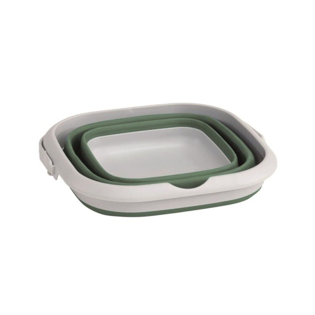 Smart foldespand, der er perfekt til campingpladsen. Konstruktion i silikoniseret gummi som er varmebestandig, nem at rengøre og som samtidig sikrer at spanden ikke folder ufrivilligt. Også velegnet til at bære opvasken til servicehuset. At den er sammenklappelig giver en meget lille pakkestørrelse.