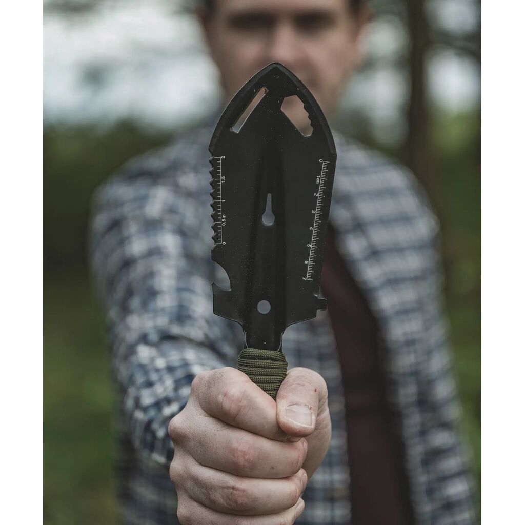 En alsidig håndskovl med blad i rustfrit stål, perfekt til skæring, gravning og andre situationer. Skovlen har en tandet kant, lineal og flaskeåbner. Håndtaget er viklet med paracord og giver et sikkert greb. Denne håndskovl er ideel til camping, vandreture eller nødsituationer.