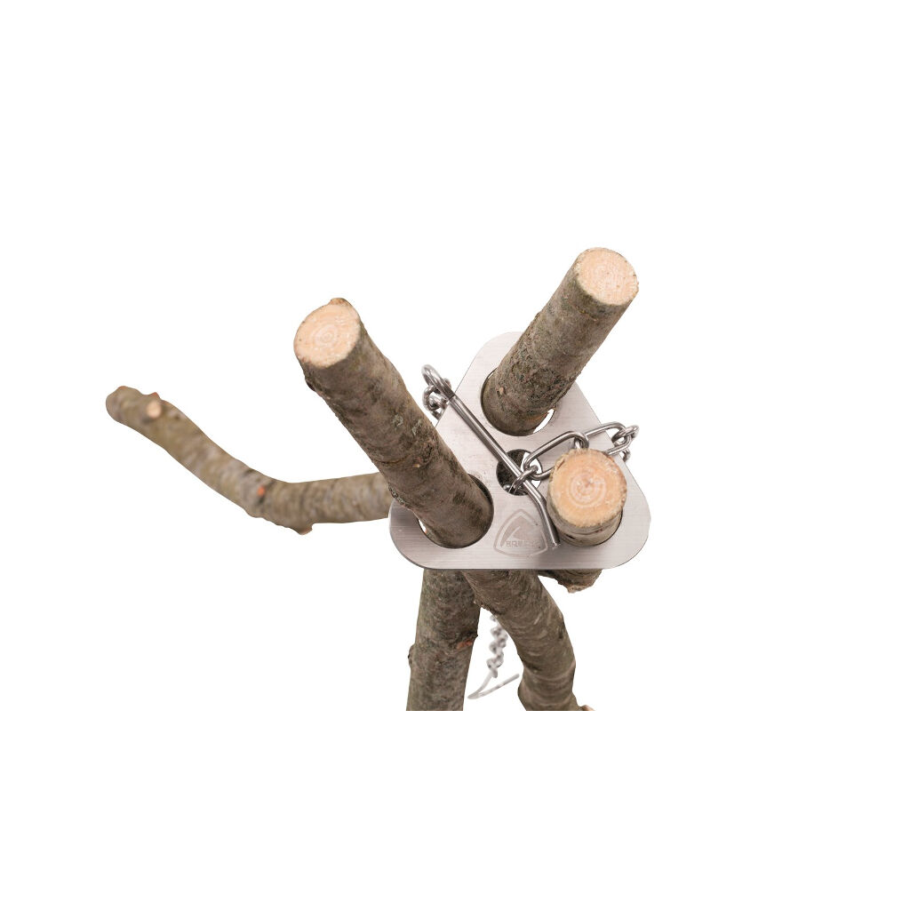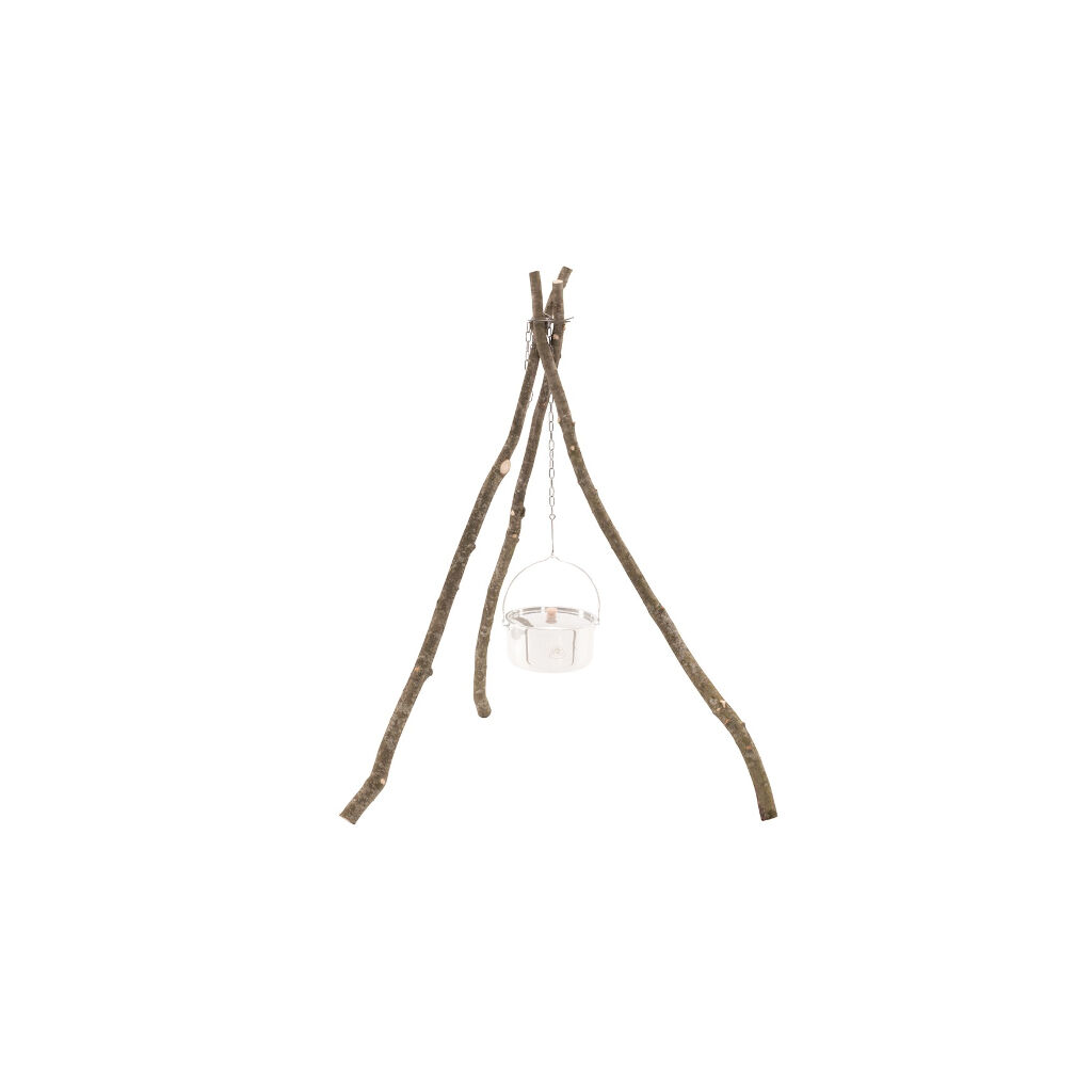 Indsæt 3 pinde fra naturen og bøj benene ud, og du har et hjemmelavet stativ klar til madlavning over åben ild. Adapteren leveres med en kæde, som du kan justere temperaturen/højden på bålet med. Enkel og fleksibel måde at lave dit eget stativ på.