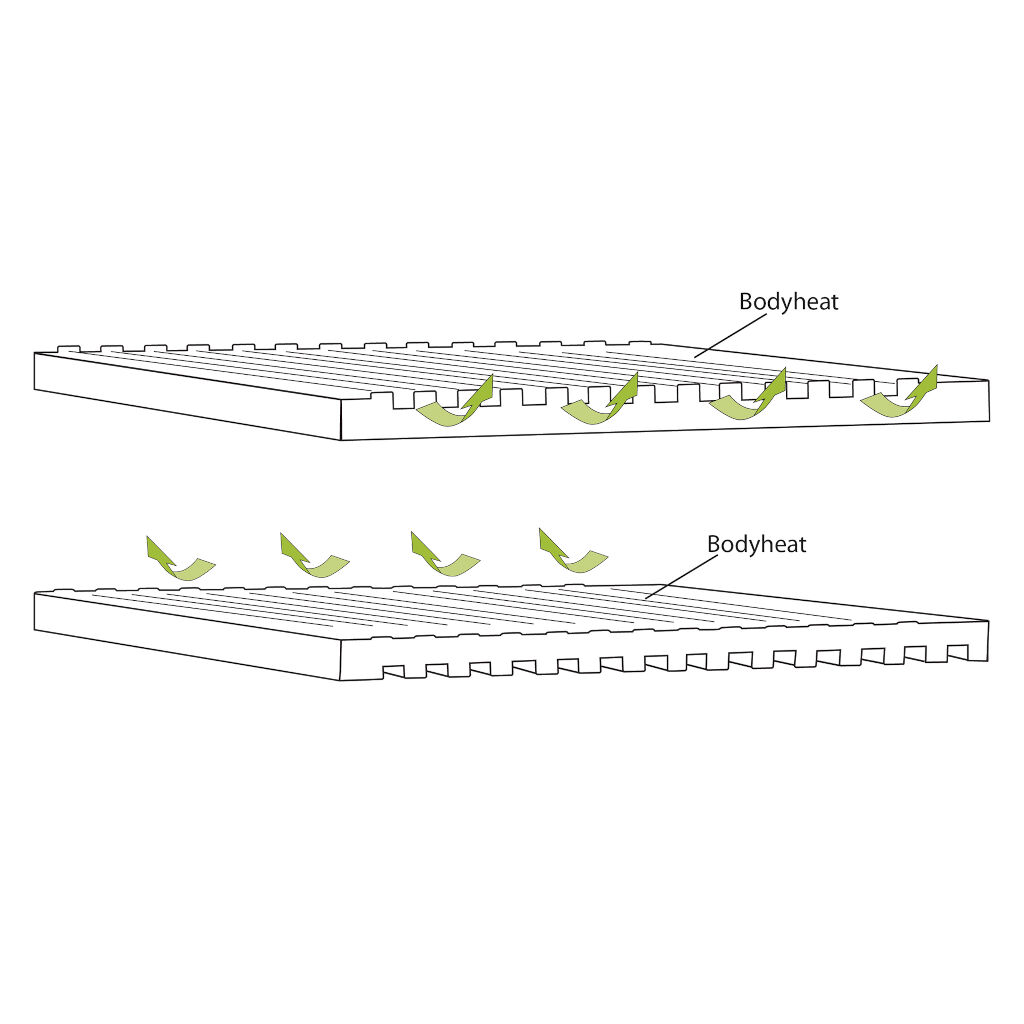 12 cm tykt selvoppustelig liggeunderlag med kraftigt skumfyld som giver en meget sengelignende følelse og bedre stabilitet i kanterne. En smart løsning er, at den giver forskellig isolering alt efter hvilken side du lægger op. Det vil sige en side med bedre ventilation til sommeren og en med bedre isolering til den koldere del af campingsæsonen.