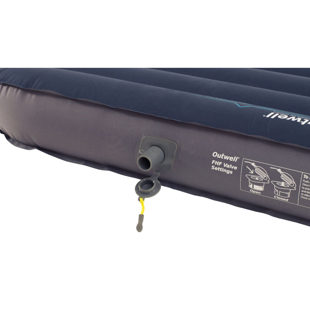 Luftmadras med isolerende lag Isofill Premium som gør madrassen velegnet til brug fra forår til efterår, da den beskytter mod jordkulde. Madrassen har vandrette kanaler som giver en god vægtfordeling, er pakkebar og nem at have med. En stor fordel for dig, der ønsker at reducere pakkestørrelsen, er, at ventilen kan bruges sammen med pumpeposer, så den samlede pakkestørrelse inklusive pumpeposen bliver meget lille. Outwell Flat High Flow ventil med kontraventil og dobbelte tætninger gør den sikker og nem at fylde og tømme.