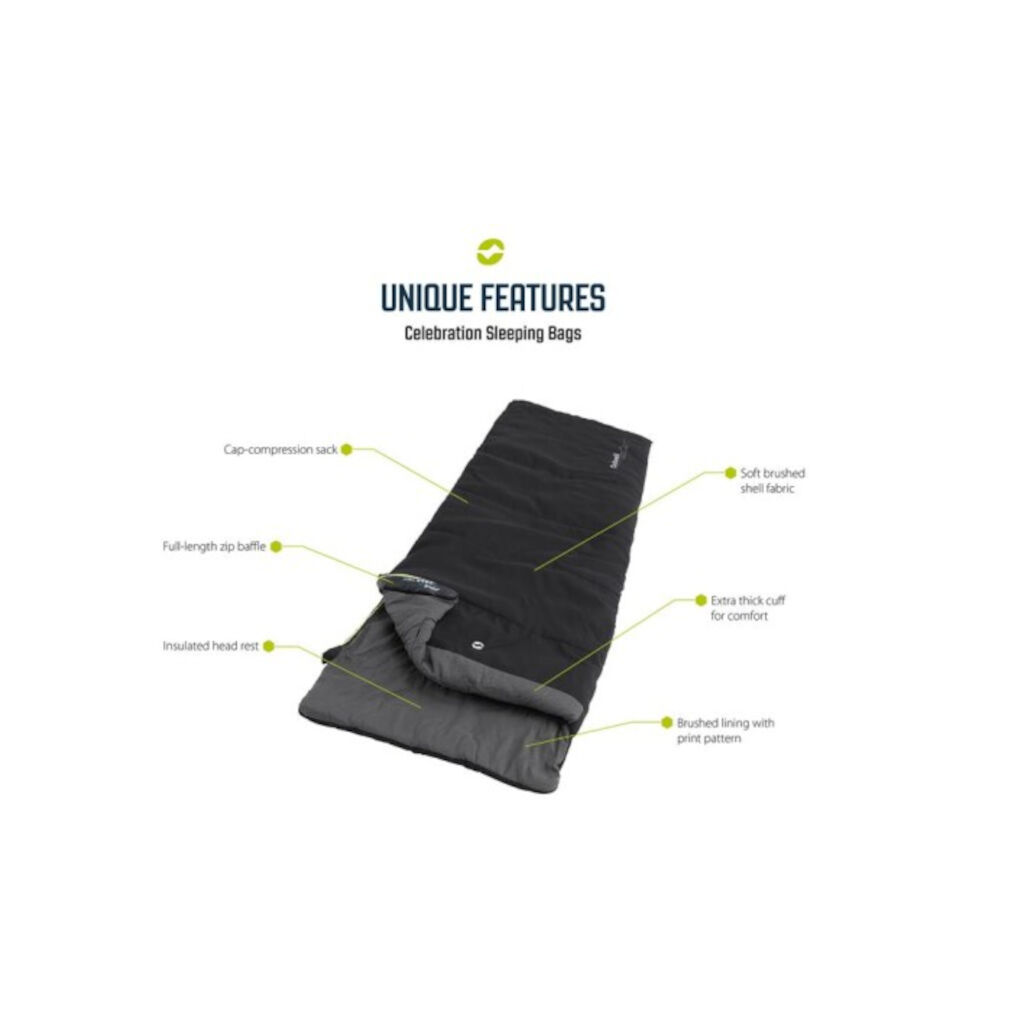 Dobbelt campingsovepose, der kan åbnes op og bruges som et almindeligt tæppe. Den ekstra tykkelse og den bløde inderside gør den behagelig at ligge i. Soveposen er egnet til hele campingsæsonen fra forår til efterår. Outwell Celebration Lux leveres pakket i en kompressionstaske, hvilket gør den nem at pakke og beskytter under transport.