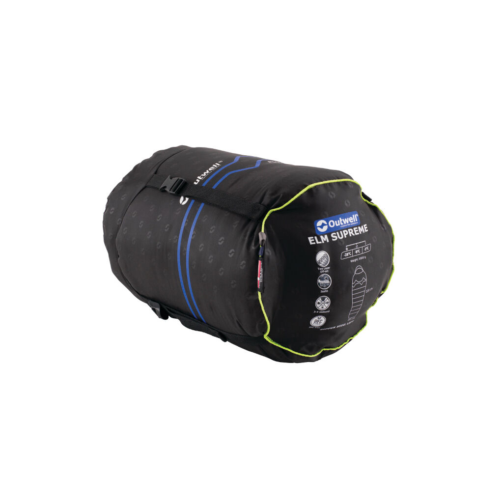 Meget varm og rummelig campingsovepose med en pakkestørrelse på kun 23 x 38 cm. Supreme modellen har to-lags isolering kombineret med ekstra Isofill-premium fyld, der giver rigtig god isolering, høj komfort og lille pakkestørrelse. Soveposens bløde inderside kombineret med det luftige fyld giver en meget dunagtig komfort i soveposen. Soveposen har ekstra plads i fodenden, er ekstra bred og mumieformet, hvilket optimerer forholdet mellem vægt og varme. Lynlåsen er beskyttet med en overfoldet kant med polstring, der forhindrer varmelækage.