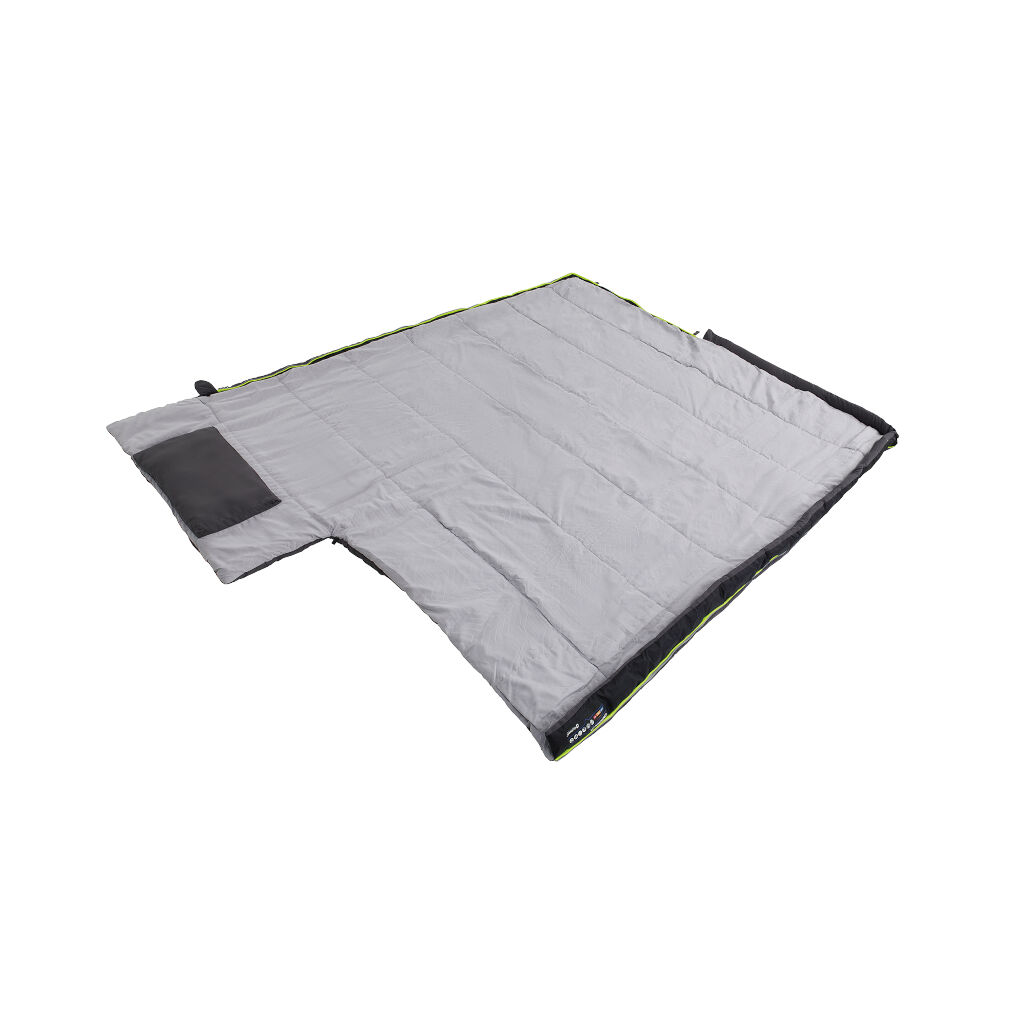 Prisvenlig campingsovepose med indbygget pude, der nemt kan åbnes og bruges som almindeligt tæppe. Dobbeltlagsfyld minimerer risikoen for kolde pletter. Lynlås med overlappende kant beskytter mod træk og giver fremragende termisk komfort, selv ved lavere temperaturer. Takket være lynlåsen, der kan åbnes fra bunden, kan fodenden åbnes for at regulere temperaturen i soveposen på varmere nætter. Børstet polyester på indersiden gør den behagelig at sove i. Sækken leveres pakket i en kompressionspose, der gør den nem at pakke og beskytter under transport.