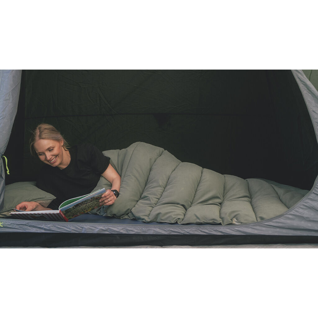 Tæppe med en meget blød overflade og en isolering, der giver en dunlignende følelse. Perfekt som ekstra varme på kølige aftener, mod morgenkulden eller over soveposen på koldere nætter.