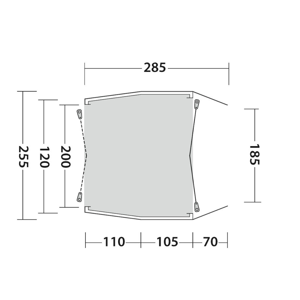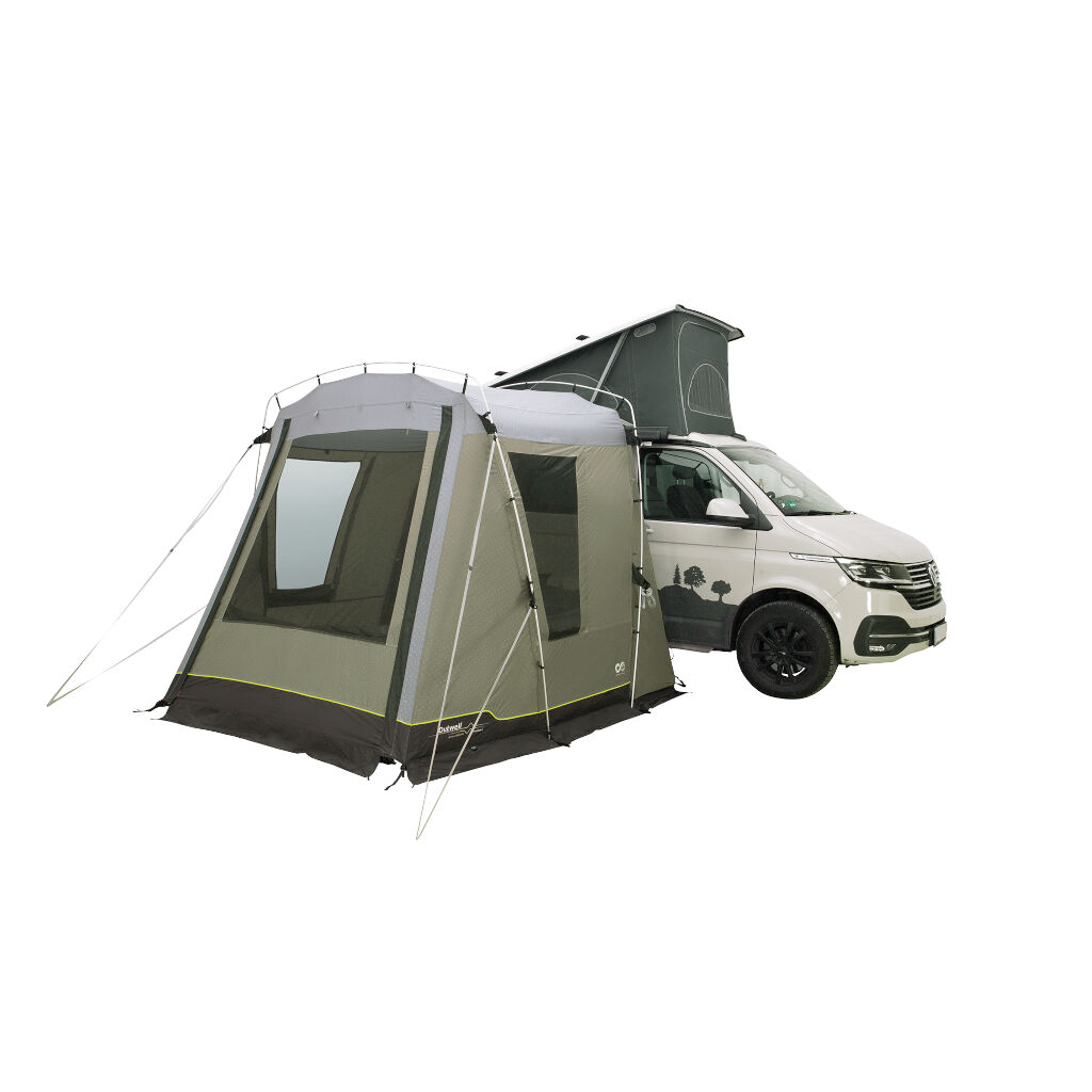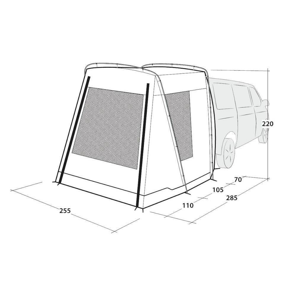 Outwell Dunecrest L er et fritstående telt, der placeres mod autocamperens eller bilens bagklap. Perfekt til at skabe ekstra plads til madlavning, udstyr eller til at sidde i dårligt vejr. Teltet er pakkevenligt og takket være et holdbart stof og aluminiumsstænger meget robust. Fastgørelsen til køretøjet strammes til køretøjets bagdøre, mod bagdækkene, og med justerbare jordfæste. Teltet er udviklet til Peugeot Rifter, Citroën Berlingo, VW Caddy og lignende køretøjer med en højde mellem 175 och 205 cm.