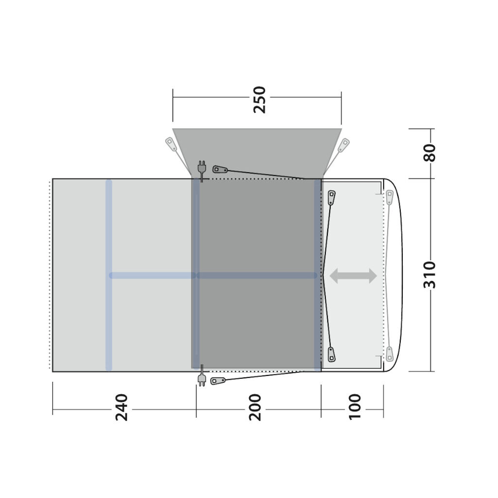 En smart funktion er, at døren i fronten kan tages af og flyttes helt ud til teltets ende. Rul derefter den indbyggede bund ud i fronten, og fastgør den på den anden side, så opholdsrummet forlænges med 115 cm. En rigtig god funktion i dårligt vejr, når du vil skabe ekstra plads til børnene, eller hvis du får besøg.