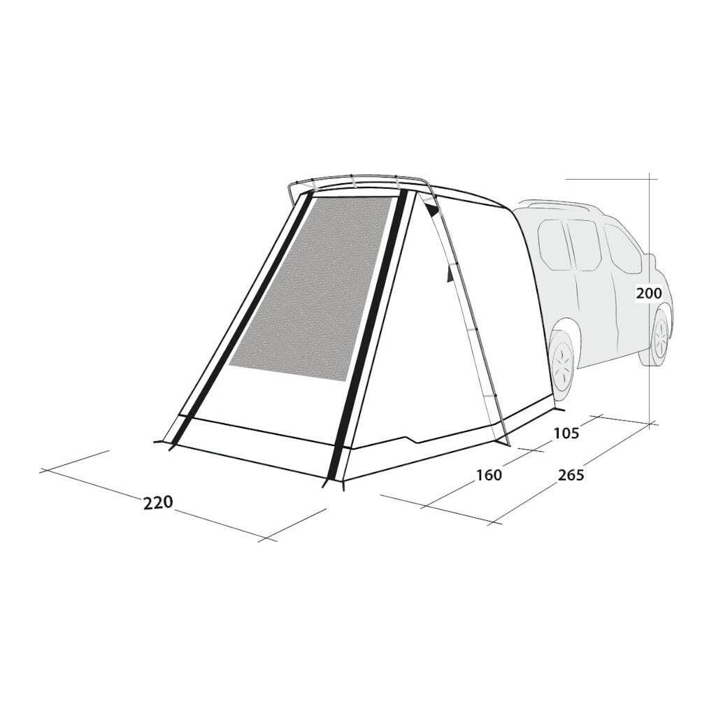 Outwell Sandcrest S er et bagklapstelt designet til at blive placeret mod bagsiden af SUV'er eller minibusser. Perfekt til at skabe ekstra plads til madlavning, udstyr, eller at sidde under tag. En åbningsbar meshvæg i midten tillader, at man kan sove i bilen med bagklappen åben, beskyttet mod insekter. Teltet er pakkevenligt og takket være et holdbart stof og en tykkere aluminiumsstang er det meget robust. Fastgørelsen til bilen er fleksibel og uden snore, der stikker ud og er i vejen. Dette takket være fastgørelser, der strammes til bilens bagdøre, mod bagdækkene, og med justerbare jordankre. Dette gør det egnet til de fleste biler med en højde mellem 155 og 185 cm.