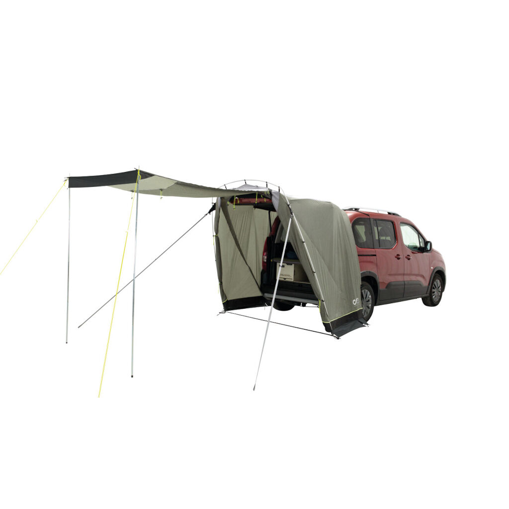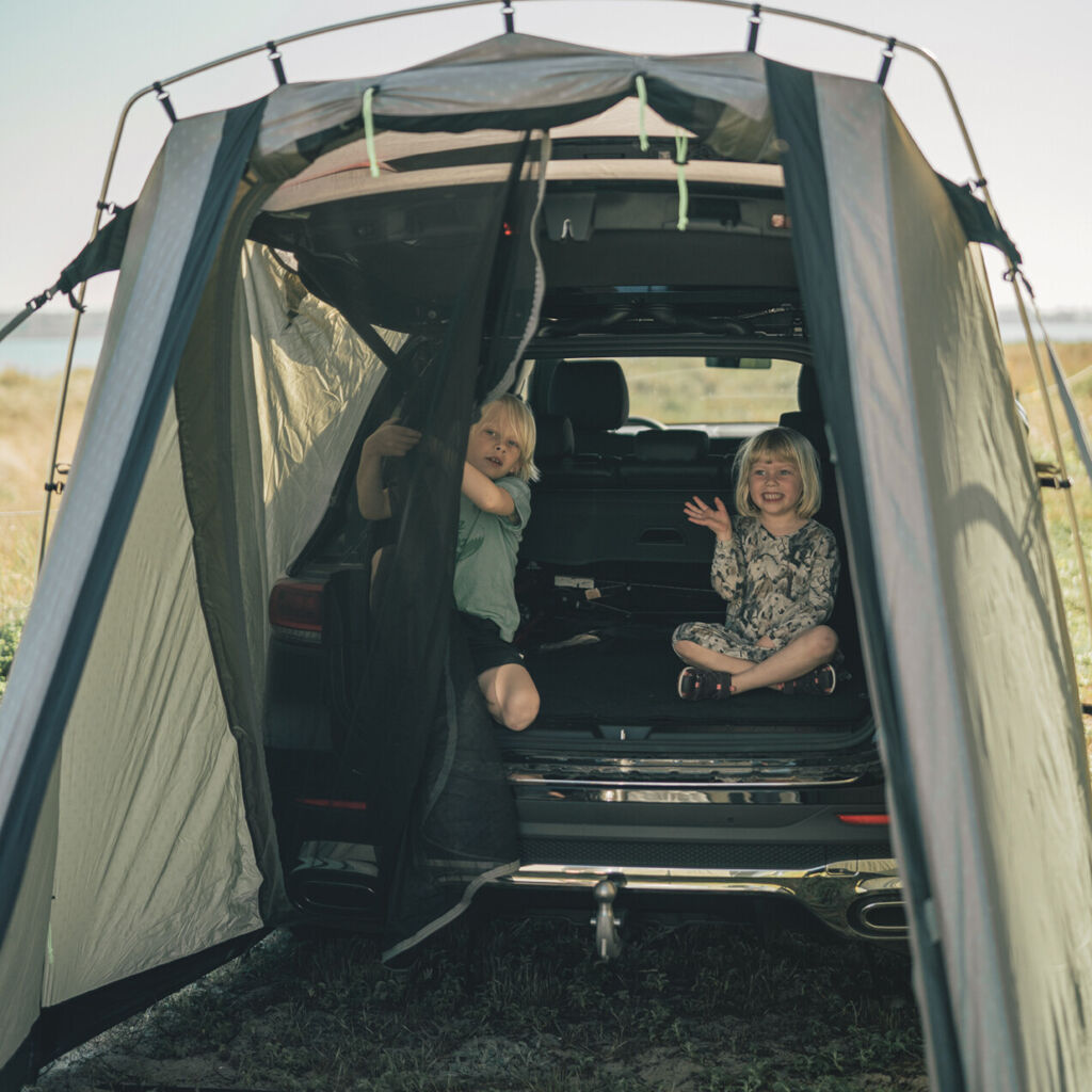 - Køretøjets bagklap kan åbnes inden i forteltet, når det er monteret