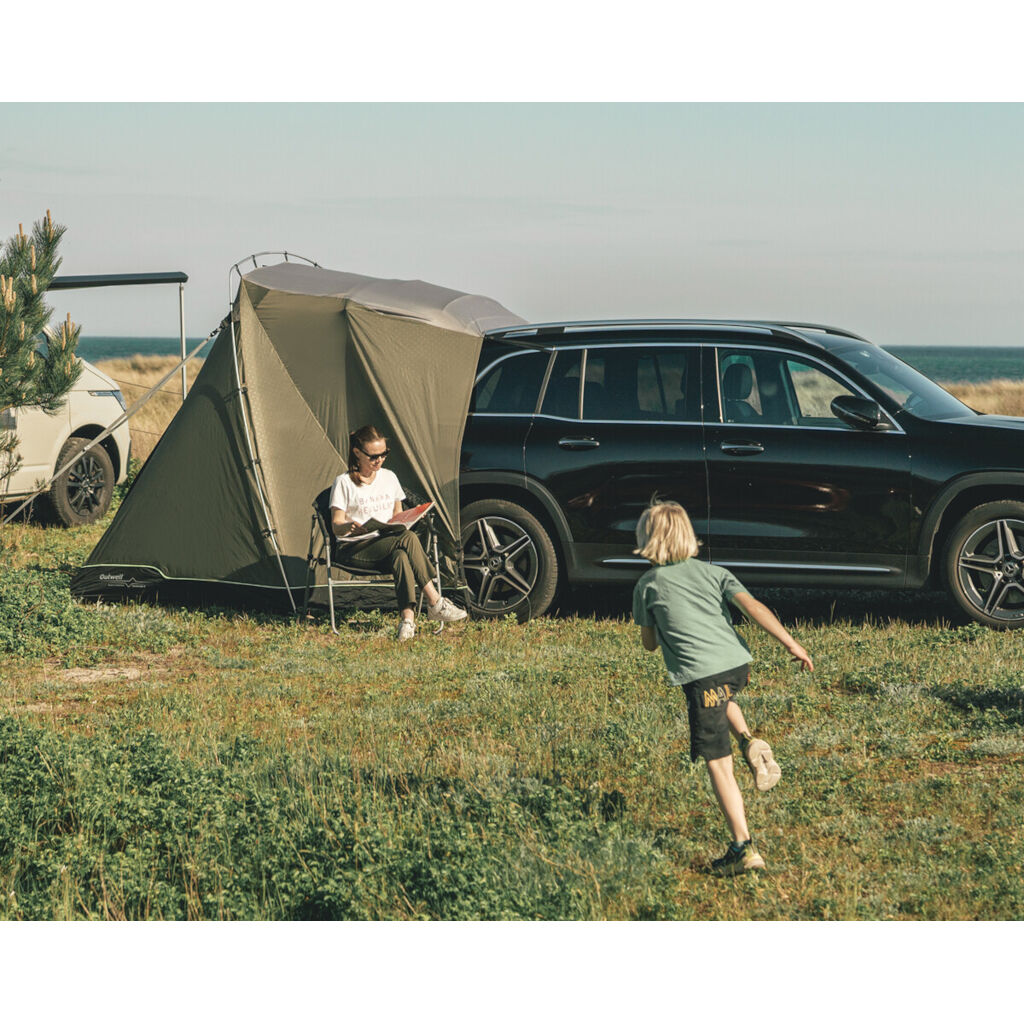 Giv din bil ekstra plads til udstyr, madlavning, eller til at sidde i. Outwell Sandcrest er et meget let, holdbart og hurtigt opsat billet, der fastgøres til bilens bagside. Med kun en aluminiumsstang er det nemt at montere og tager næsten ingen plads i bilen. Teltet fastgøres via Outwells køretøjsmonteringssystem og kræver ikke noget vulstbånd. Monteringsystemet gør, at du kan bruge de bagerste døre uhindret, selv når teltet er monteret. Teltet passer til de fleste biler med en højde mellem 155 og 185 cm. Det har en stor dør, der også kan spændes ud som soltag (tilbehør kan kræves) gør det nemt at åbne op på varme dage. Den skrå åbningsbare meshvæg gør, at man kan sove i bilen med bagagerummet åbent beskyttet mod småinsekter. Perfekt til varme nætter eller for at holde temperaturen nede i bilen om morgenen.